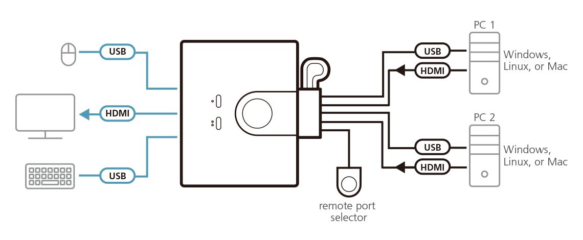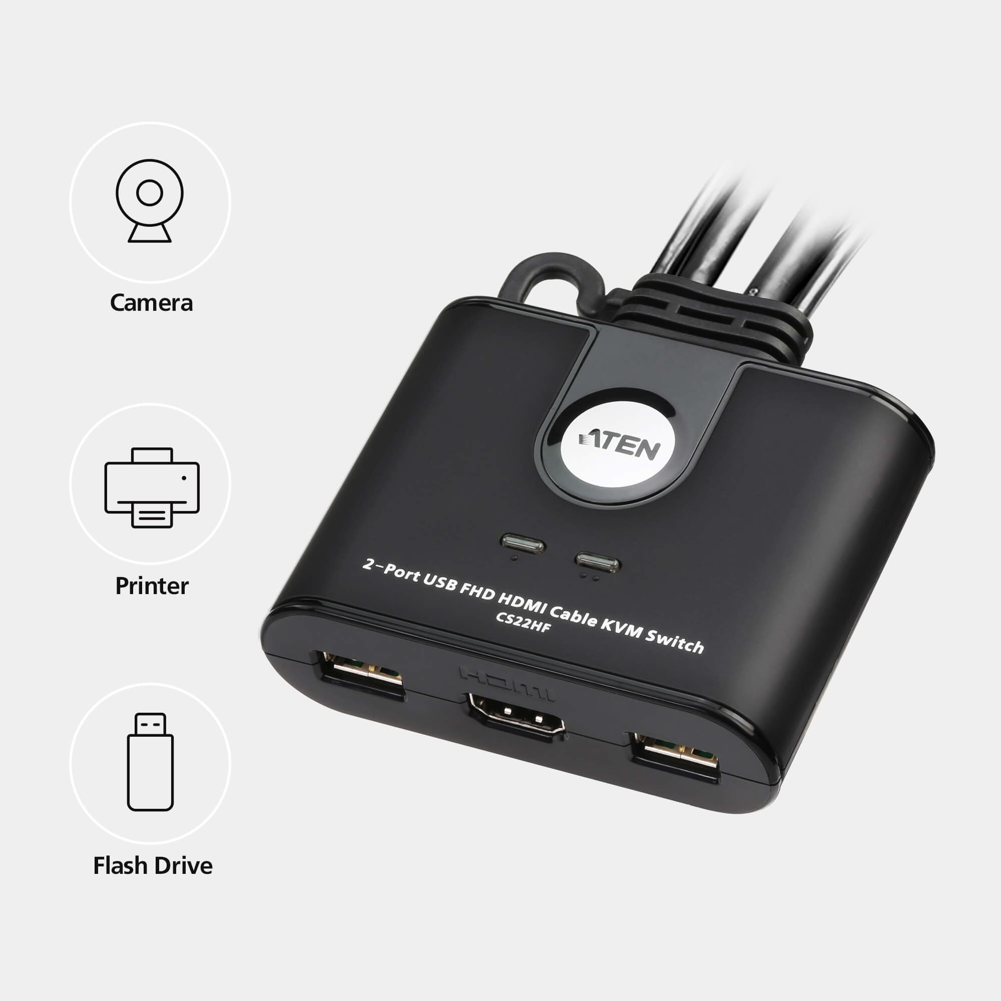 The CS22HF 2-Port USB FHD HDMI Cable KVM Switch is a control unit that allows access to two computers from a single USB and HDMI console while offering video quality up to 1920 x 1080 @ 60 Hz / 1920 x 1200 @ 60 Hz. With the CS22HF, you can quickly and effortlessly switch between two USB HDMI computers via the pushbutton on the remote port selector. The CS22HF supports multiplatform operations which allow you to switch between two different operating system PCs. Moreover, the compact and bus-powered design allows for an efficient and tidy installation, providing an ideal space-saving solution to keep your desk well-organized. This plug and play switch is ideal for people who need quick control to multitask between two computers on a desktop in any environment.