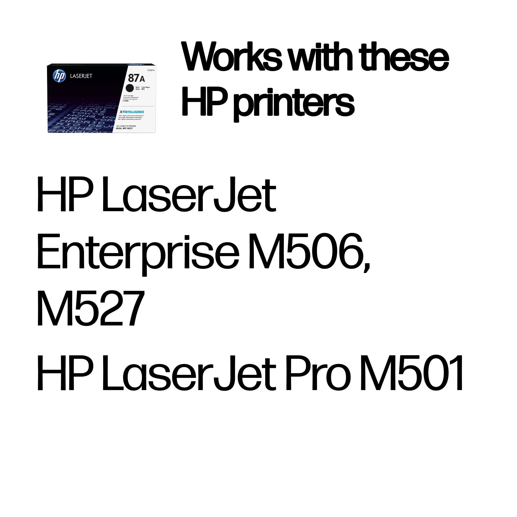 - The HP 87A Black Original LaserJet toner cartridge uses advanced toner formulation to deliver crisp, smudge-free prints that enhance document professionalism.