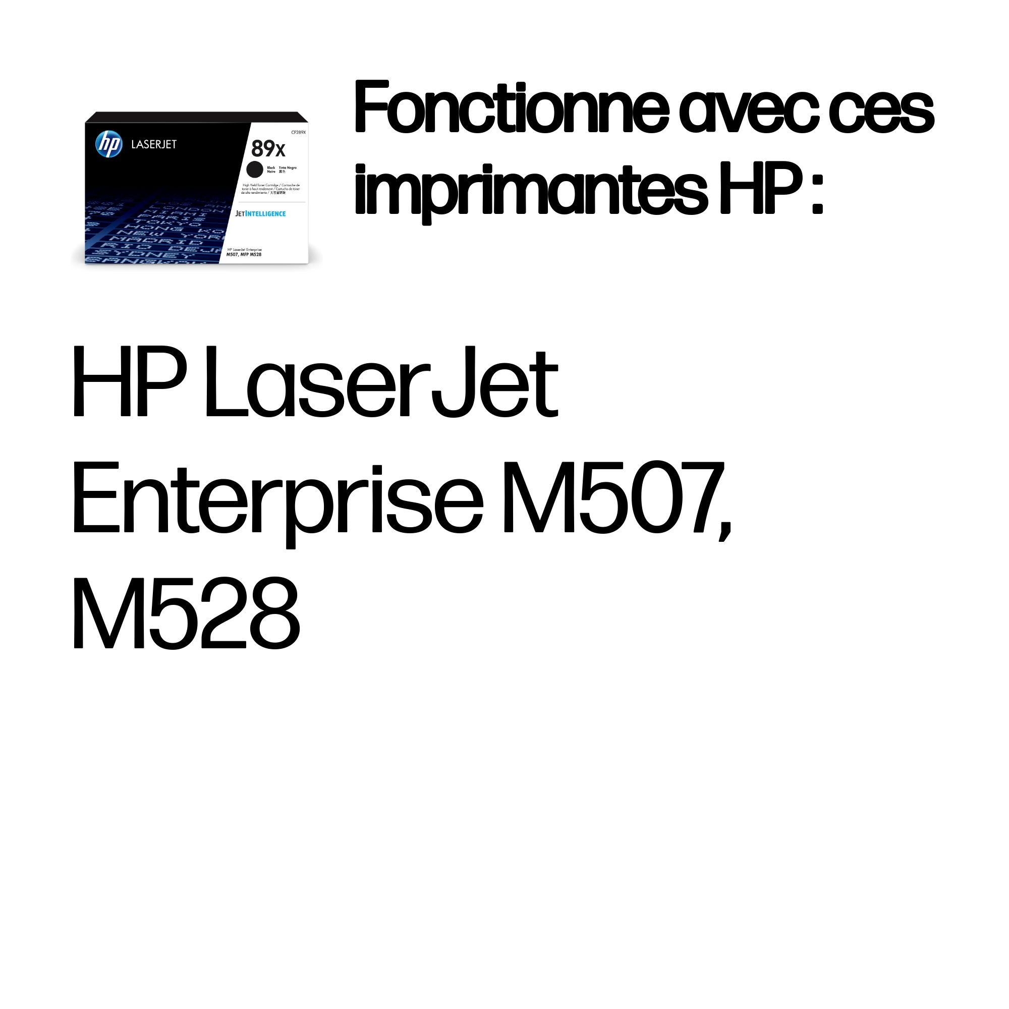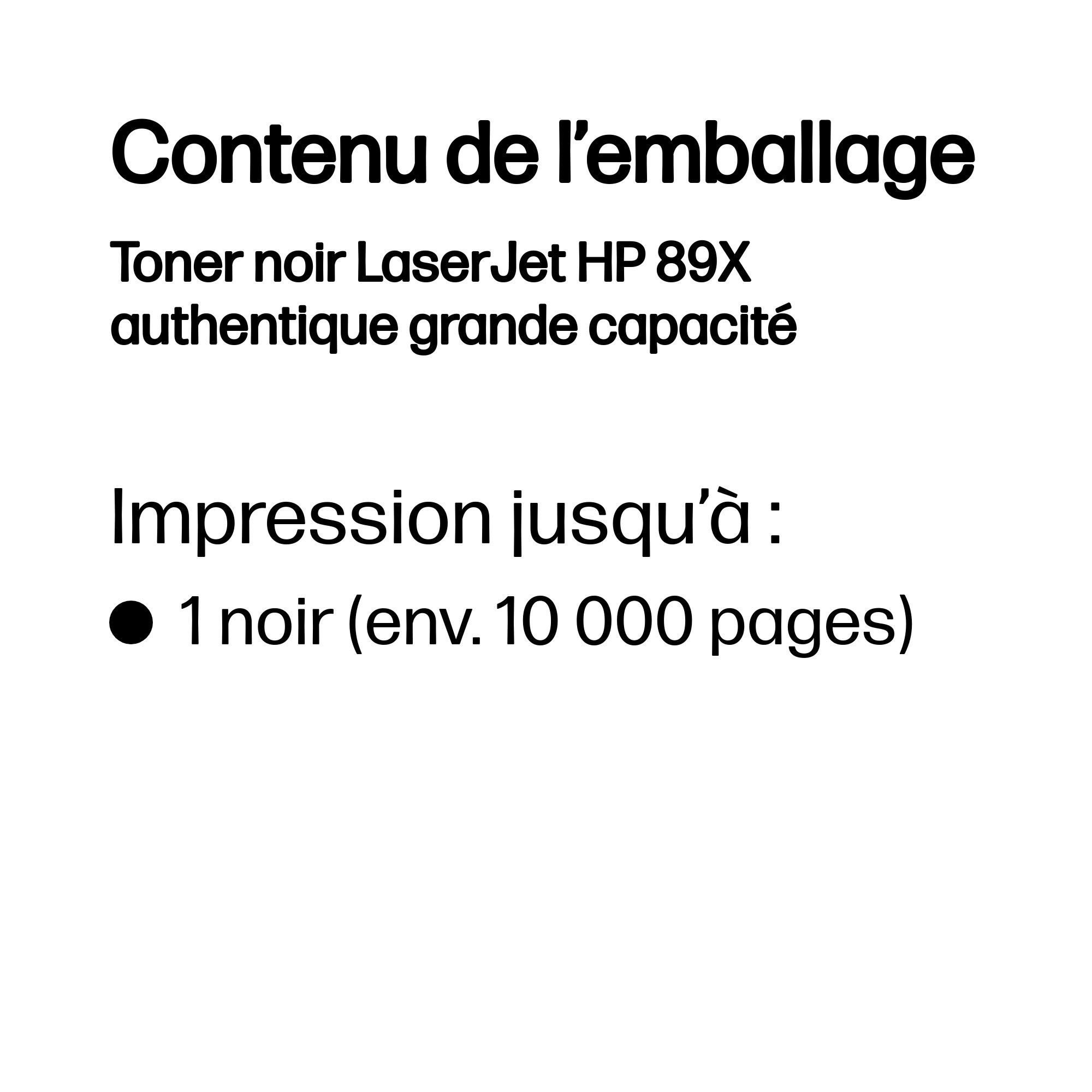 - The HP 89X High Yield Black Original LaserJet toner cartridge uses advanced toner formulation to produce crisp, smudge-resistant prints ideal for business documents.