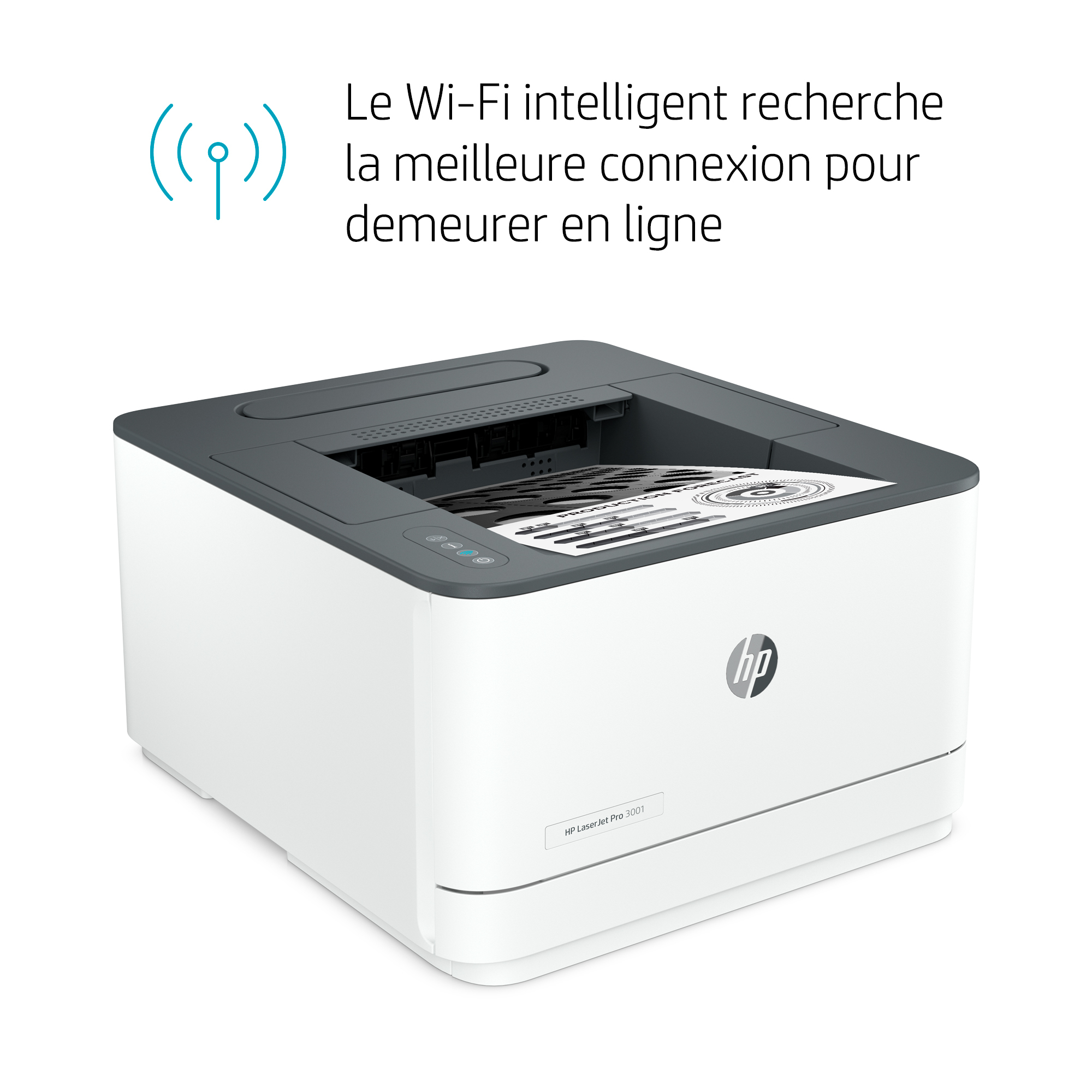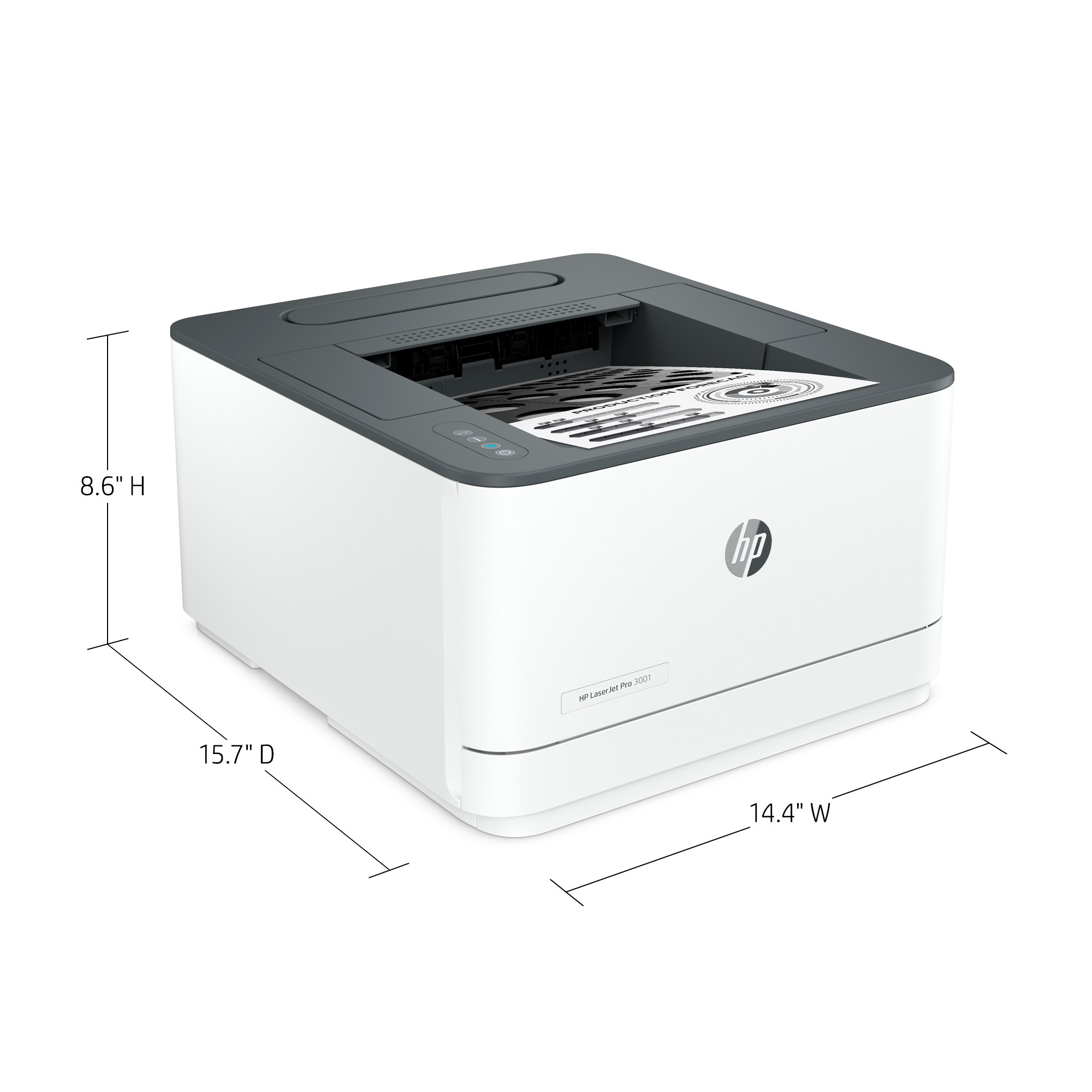 The HP LaserJet Pro 3001dw Printer features a sleek, modern design with a matte black finish that complements any office environment. Its compact footprint ensures it fits neatly on desks or shared workstations without occupying excessive space. Intuitive control buttons and LED indicators provide straightforward operation, making it user-friendly for all staff members.