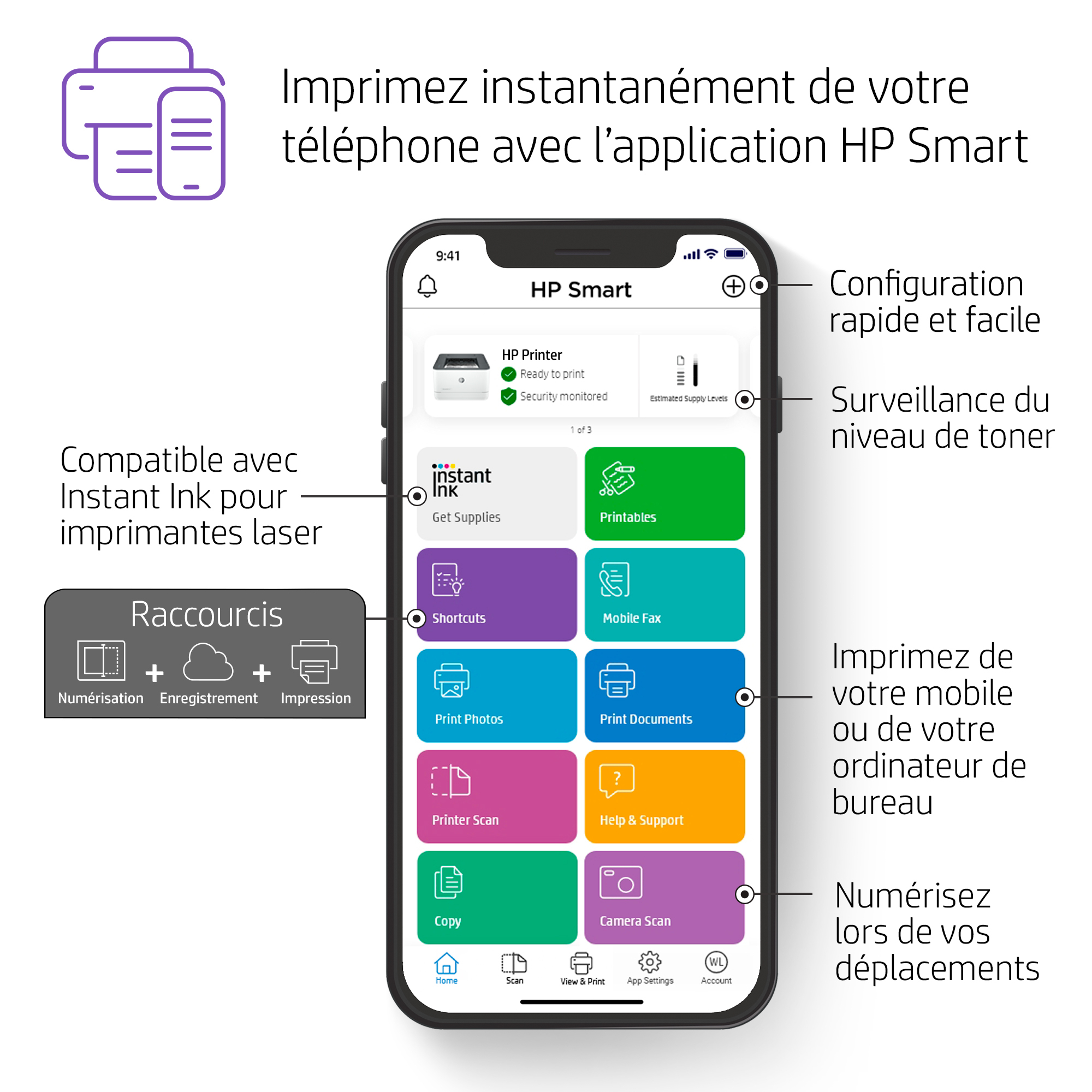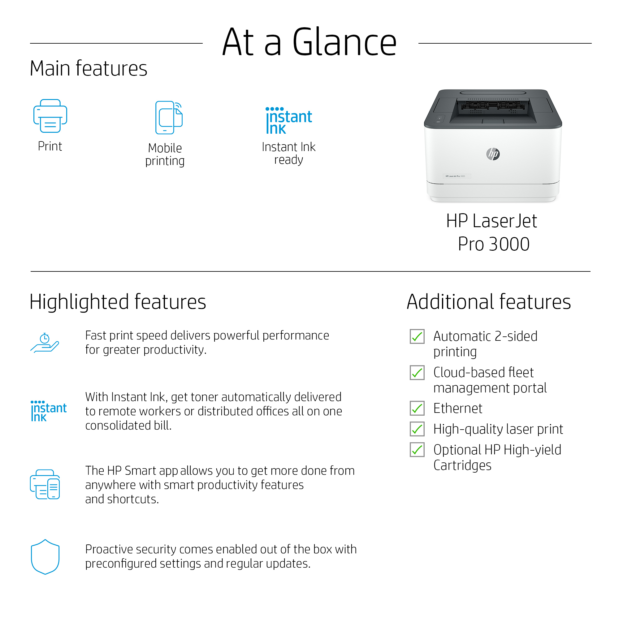 - Supports mobile printing via HP Smart app, Apple AirPrint, and Google Cloud Print, enabling hybrid teams to print effortlessly from any device.