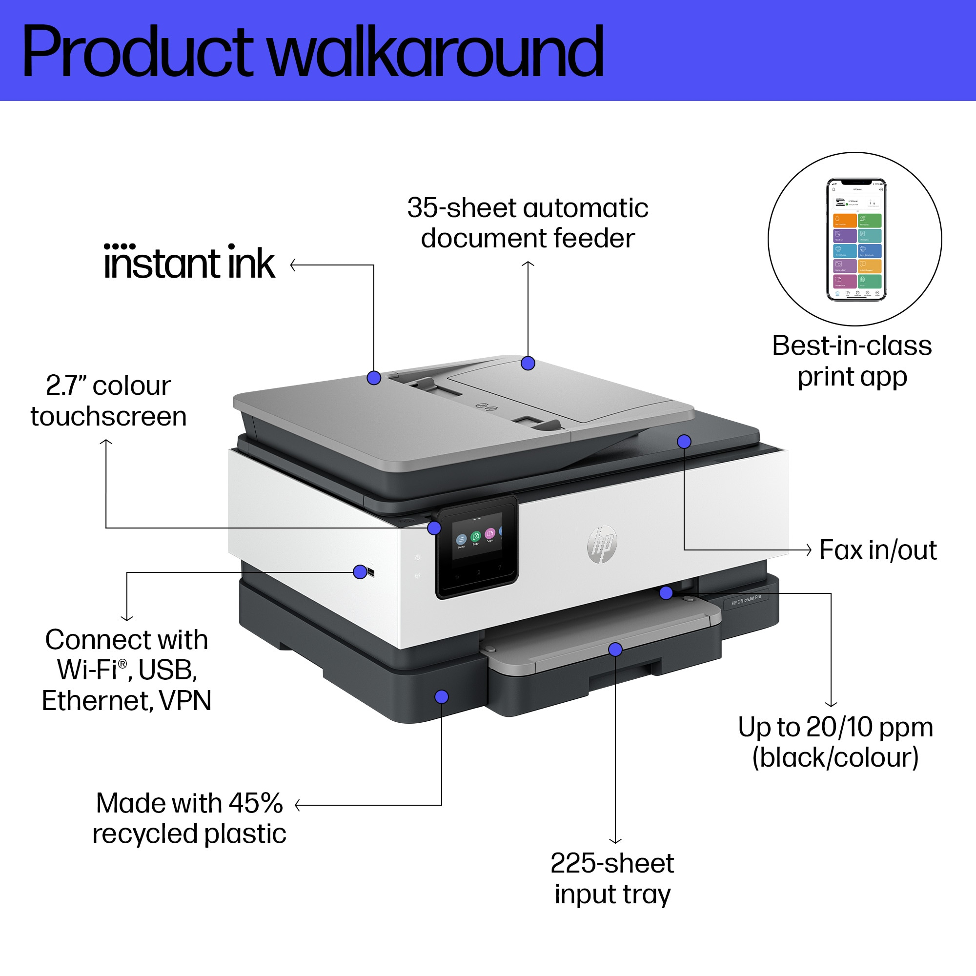 The HP OfficeJet Pro 8130e All-in-One Prntr boasts a compact and professional design that fits neatly into any office space. Its intuitive control panel with a clear display simplifies operation for all users. The sleek black and grey finish complements modern office aesthetics while maintaining durability for everyday use. This printer balances functionality with a clean, user-friendly interface.