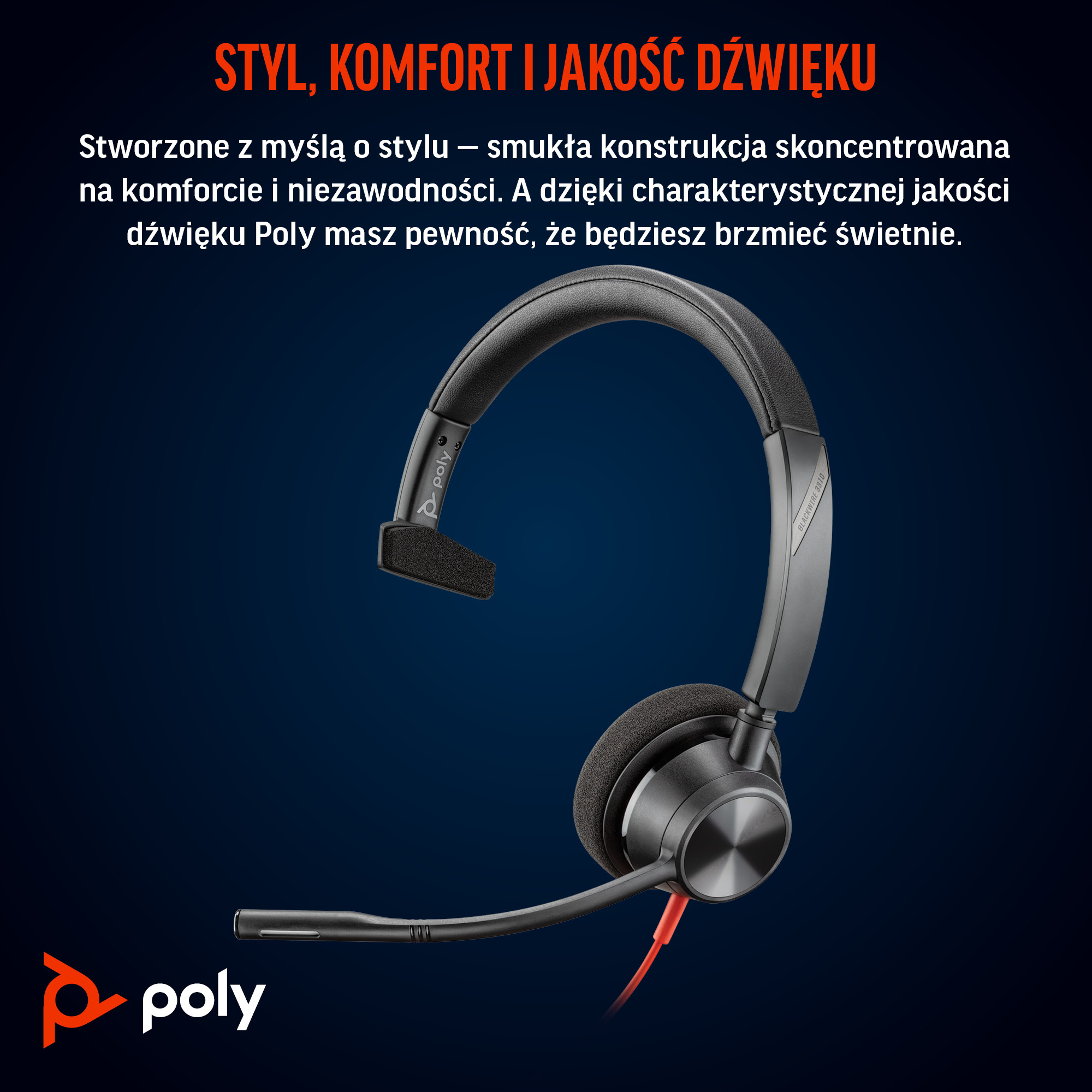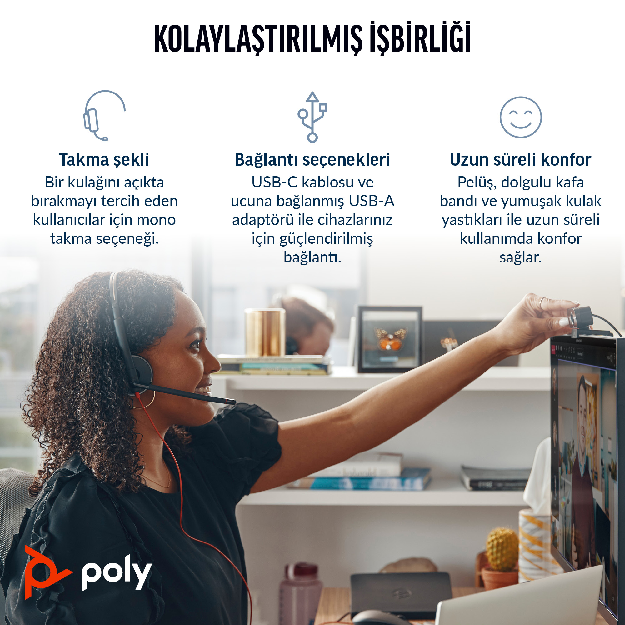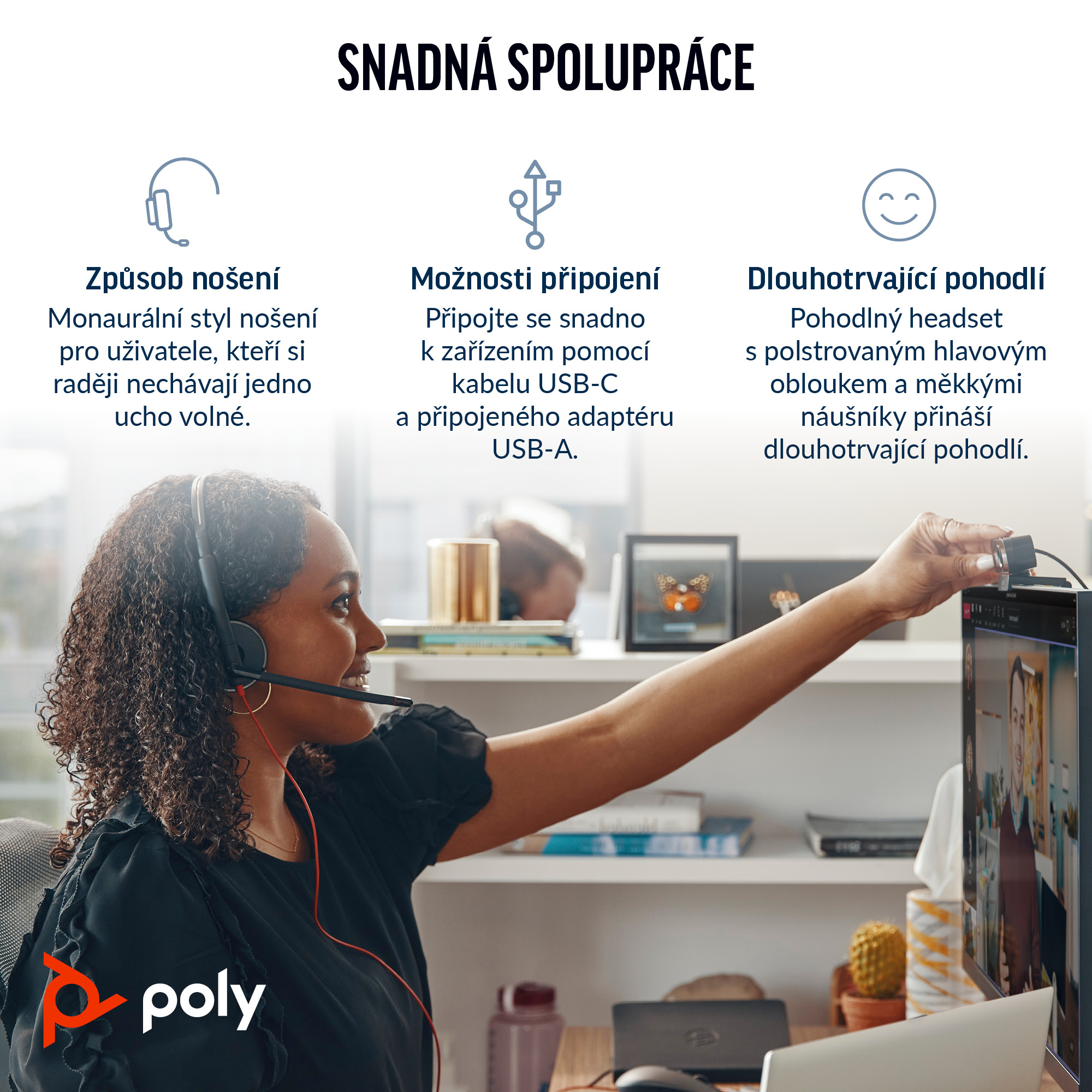 The Poly Blackwire 3310 Monaural Microsoft Teams Certified USB-C Headset +USB-C/A Adapter features a sleek, professional black finish that complements any office setup. Its lightweight and ergonomic design prioritises user comfort during long calls. The single-ear configuration keeps one ear free, allowing users to stay connected to their environment while maintaining focus on conversations. The intuitive inline controls provide easy access to call management functions.