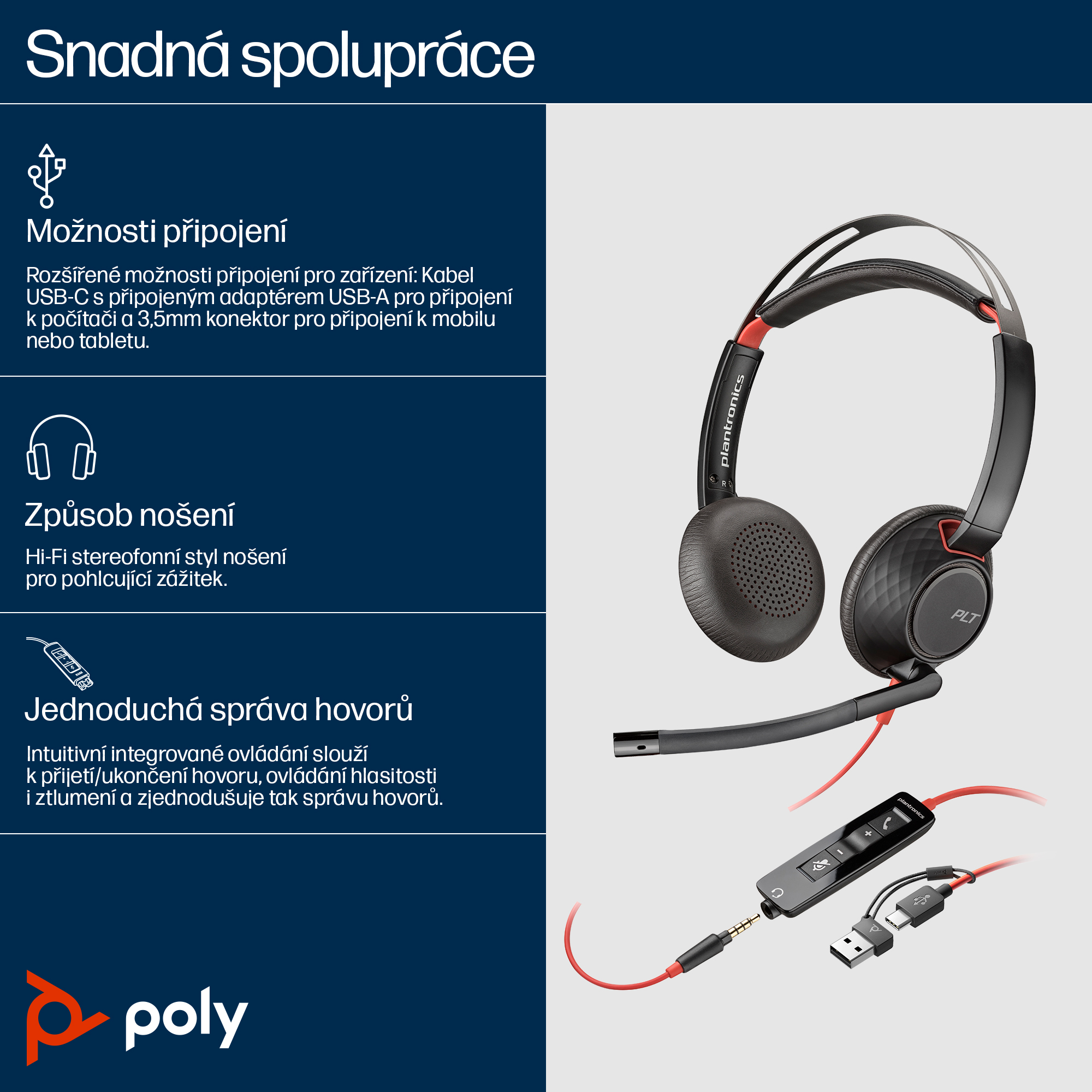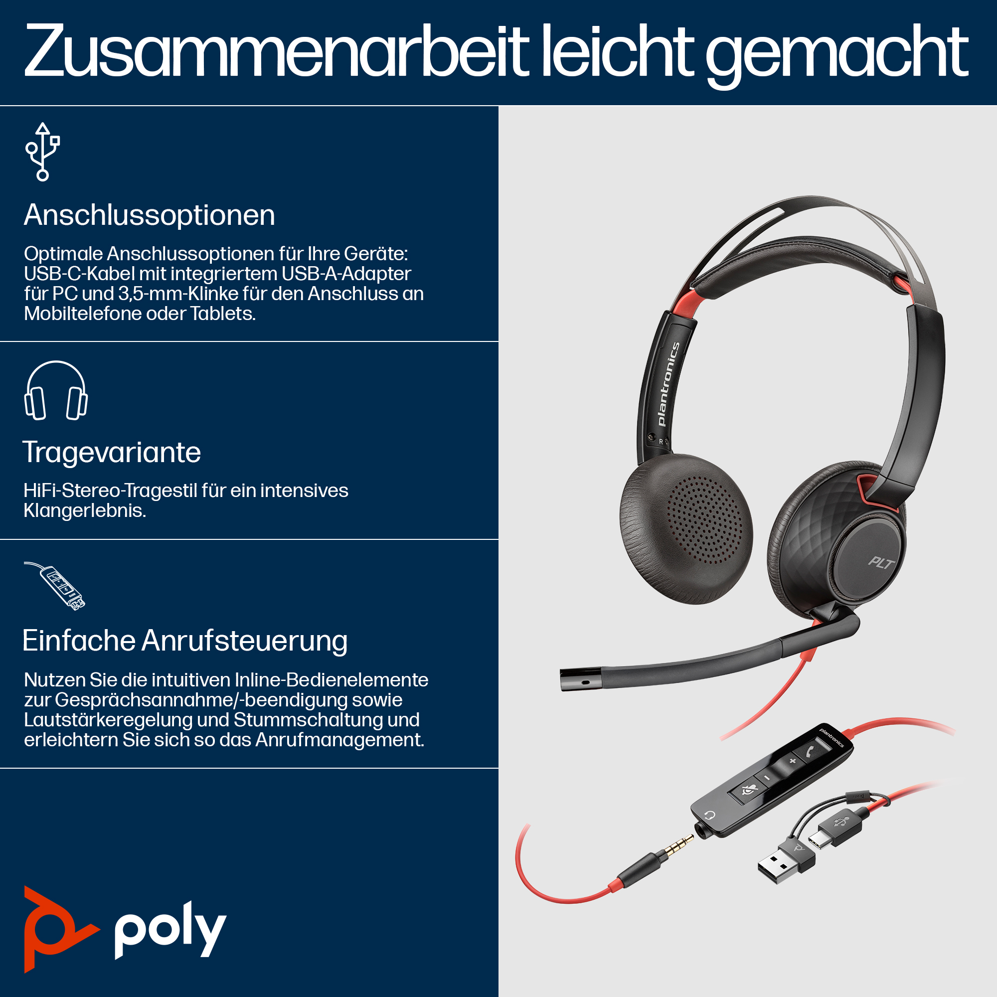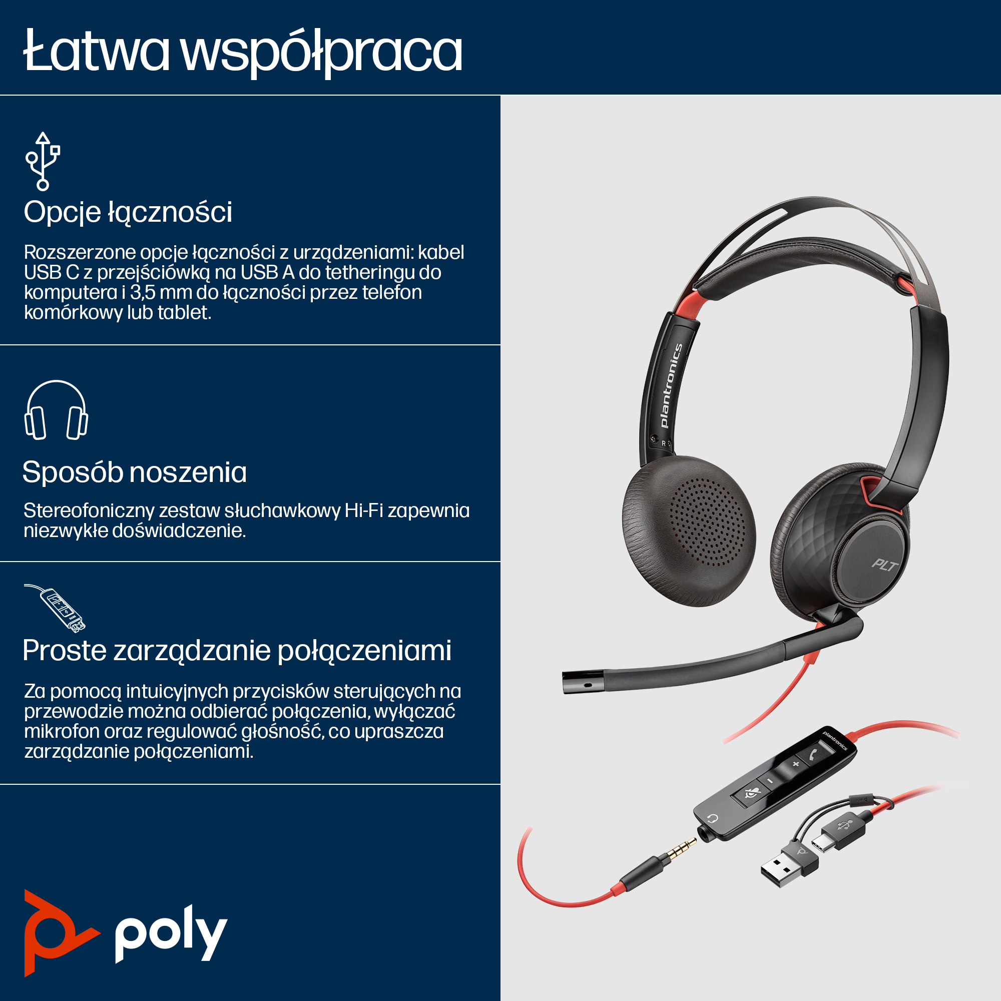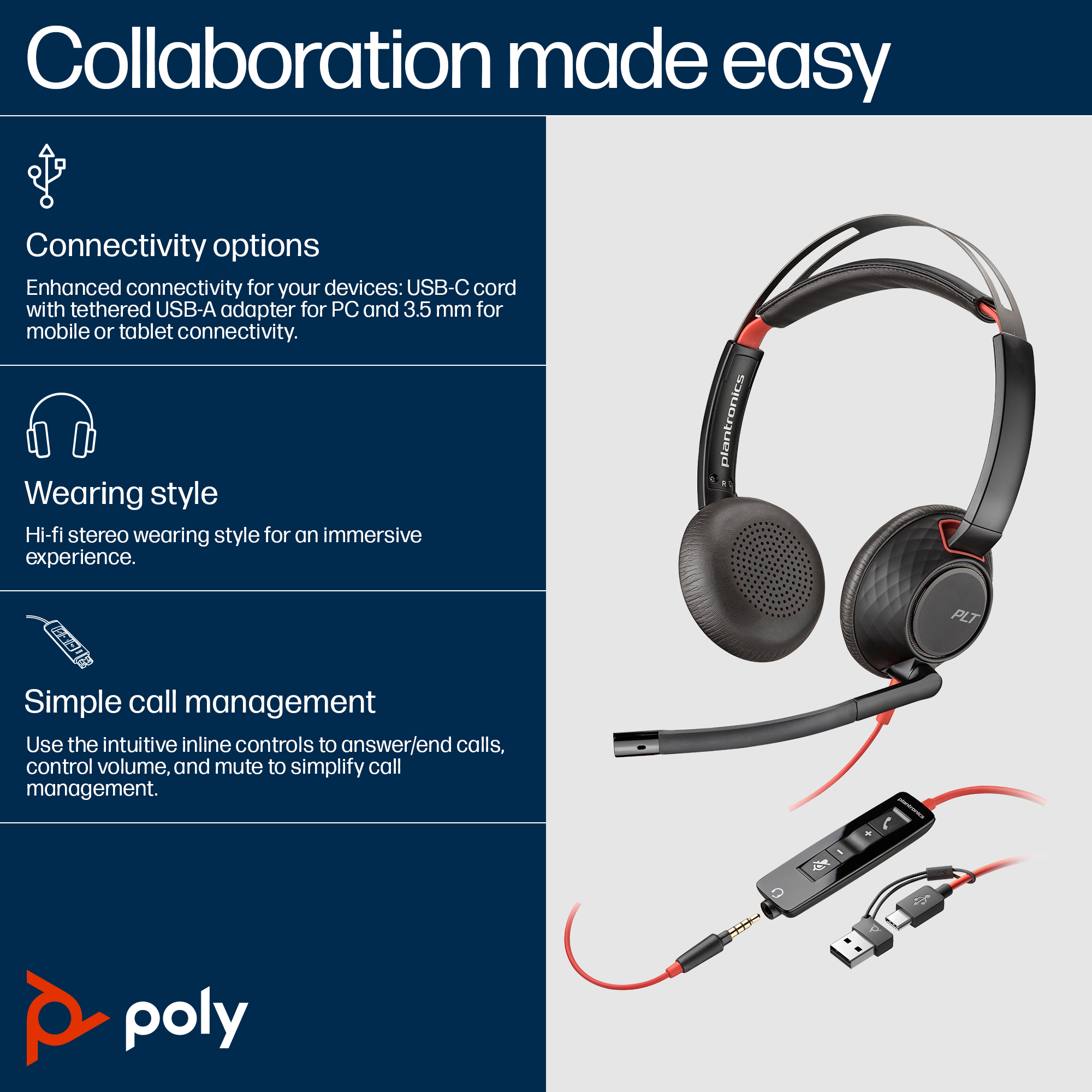 The Poly Blackwire 5220 Stereo USB-C Headset +3.5mm Plug +USB-C/A Adapter features a sleek, professional design with a matte black finish that complements any office environment. Its adjustable headband and plush ear cushions provide a secure yet comfortable fit for all-day use. The intuitive inline controls allow users to manage calls and volume effortlessly, enhancing user convenience without disrupting workflow.