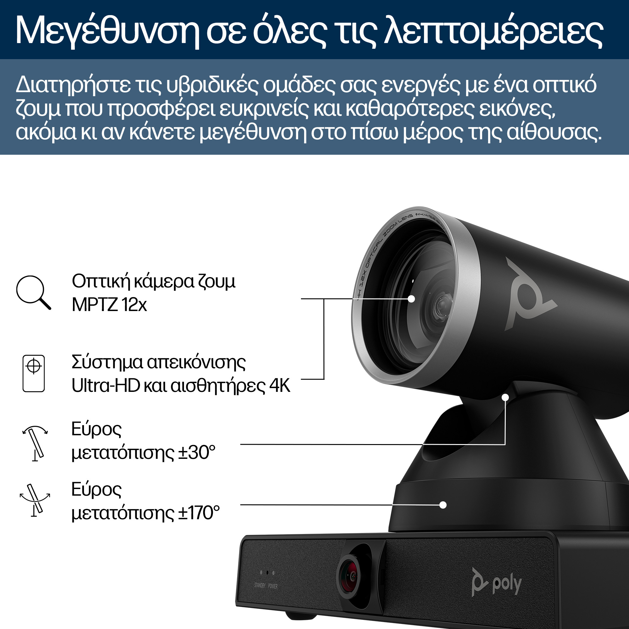 - The 12x optical zoom lens provides detailed close-ups without sacrificing image quality, ideal for large meeting spaces.