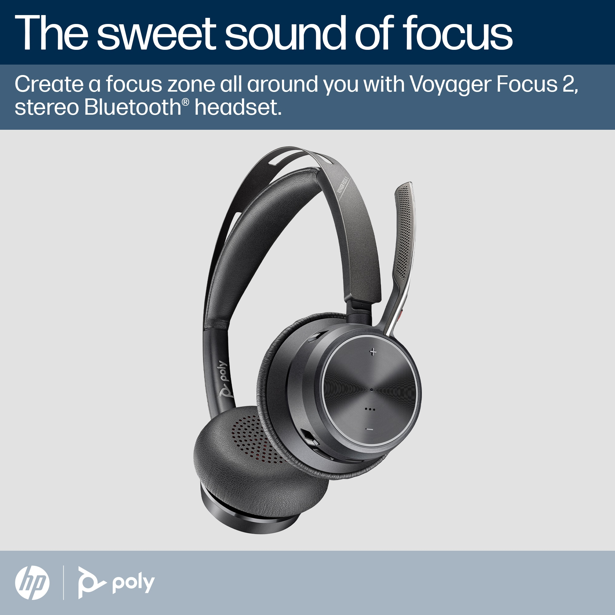 The Poly Voyager Focus 2 Microsoft Teams Certified USB-C-C Headset +USB-C/A Adapter +Charging Stand boasts a sleek, modern design with a professional matte finish. Its lightweight frame and memory foam ear cushions provide exceptional comfort, making it ideal for long meetings. The included charging stand adds a premium touch while ensuring the headset is always ready for use.