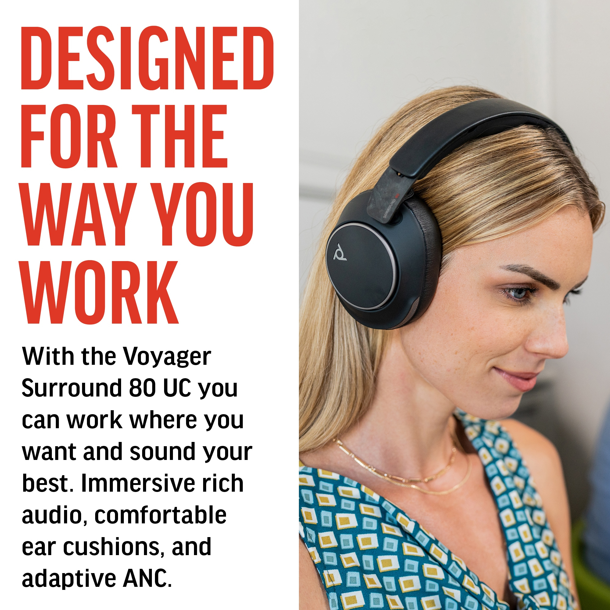 The Poly Voyager Surround 80 UC USB-C Headset +USB-C/A Adapter features a sleek, modern design with plush ear cushions that provide superior comfort during long meetings. Its lightweight frame and adjustable headband ensure a secure fit for all-day wear. The intuitive inline controls offer easy access to volume and call management, enhancing user experience without distraction.