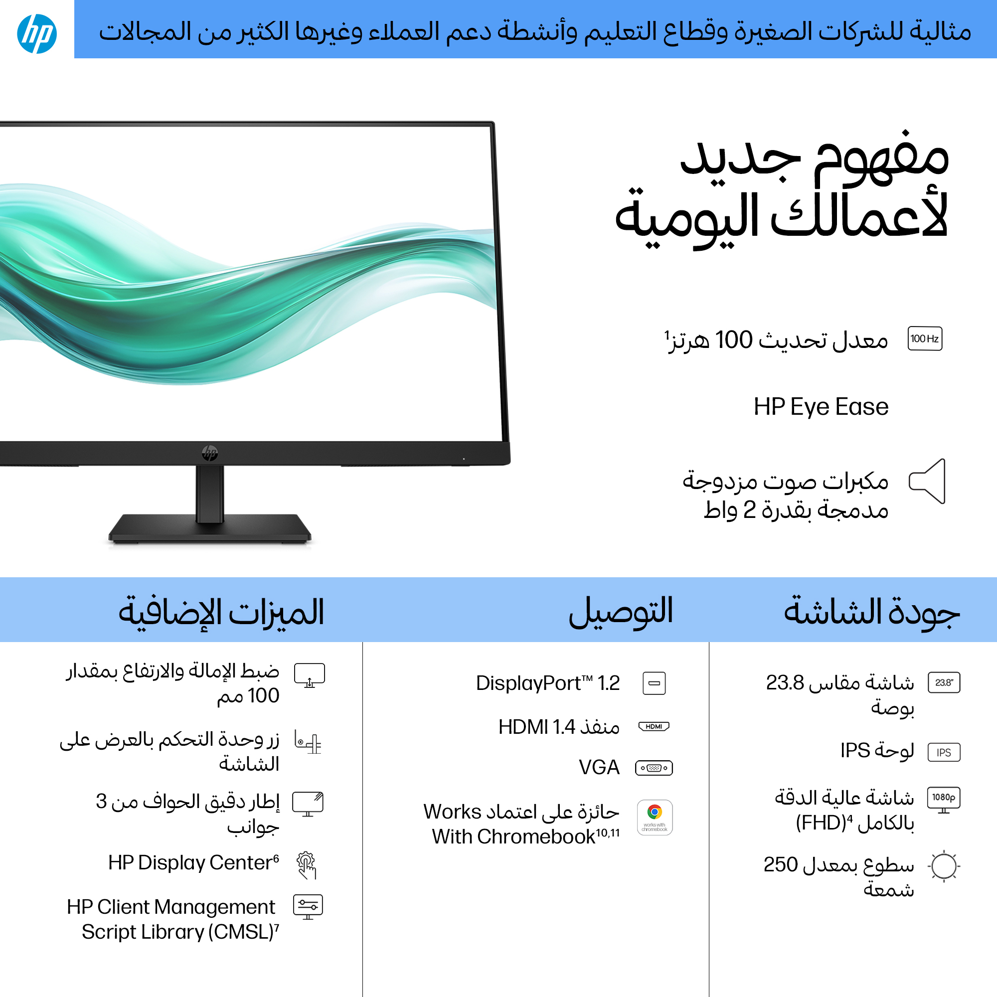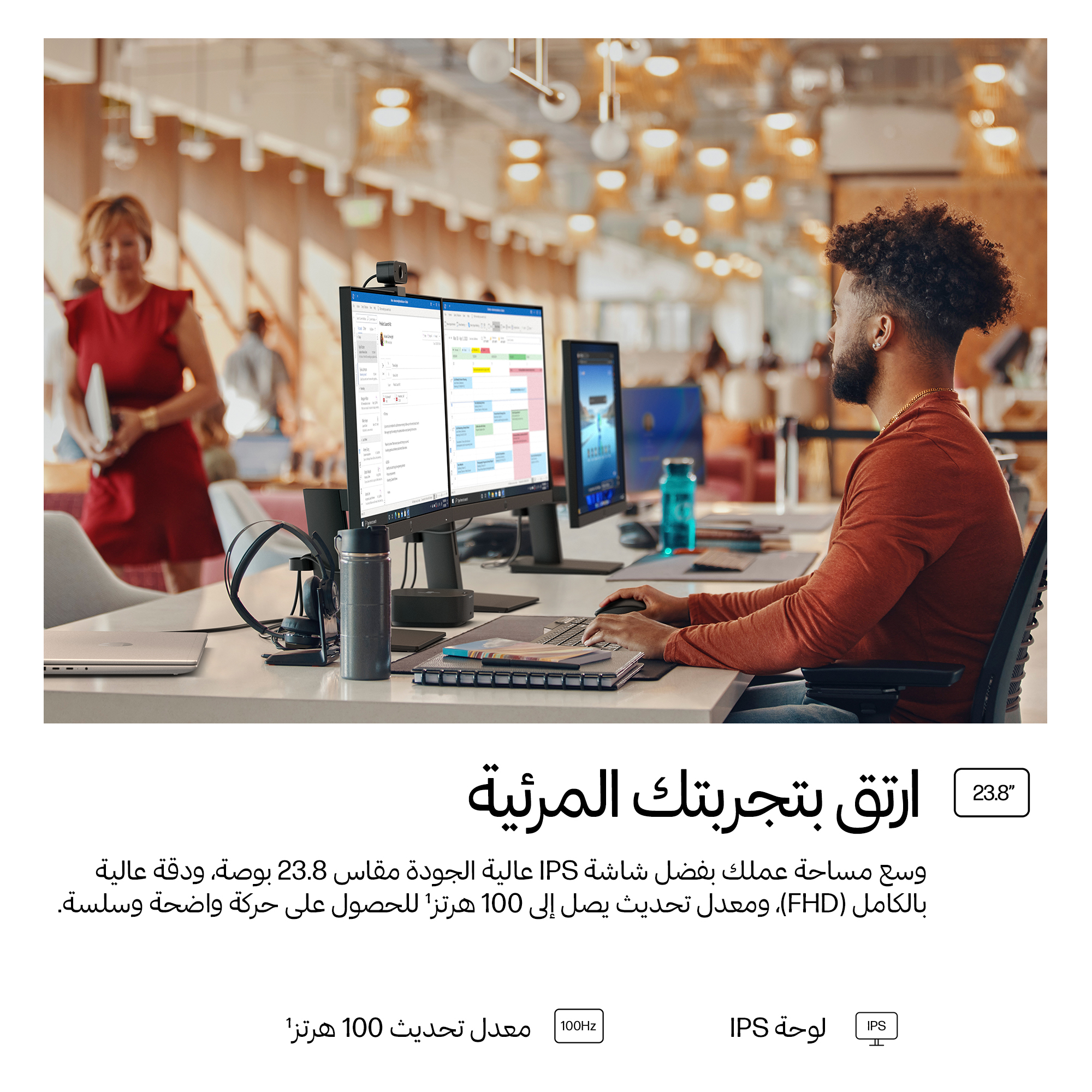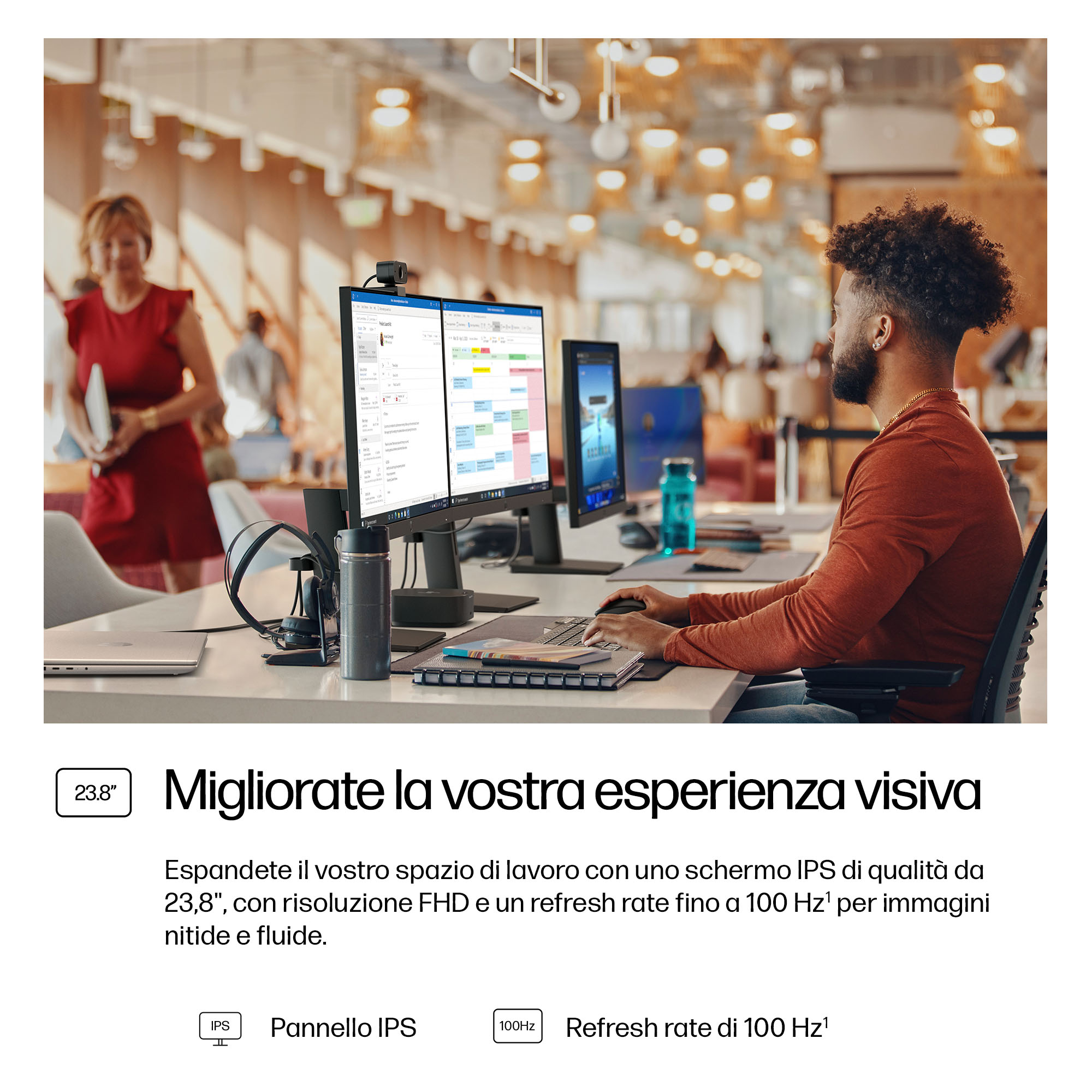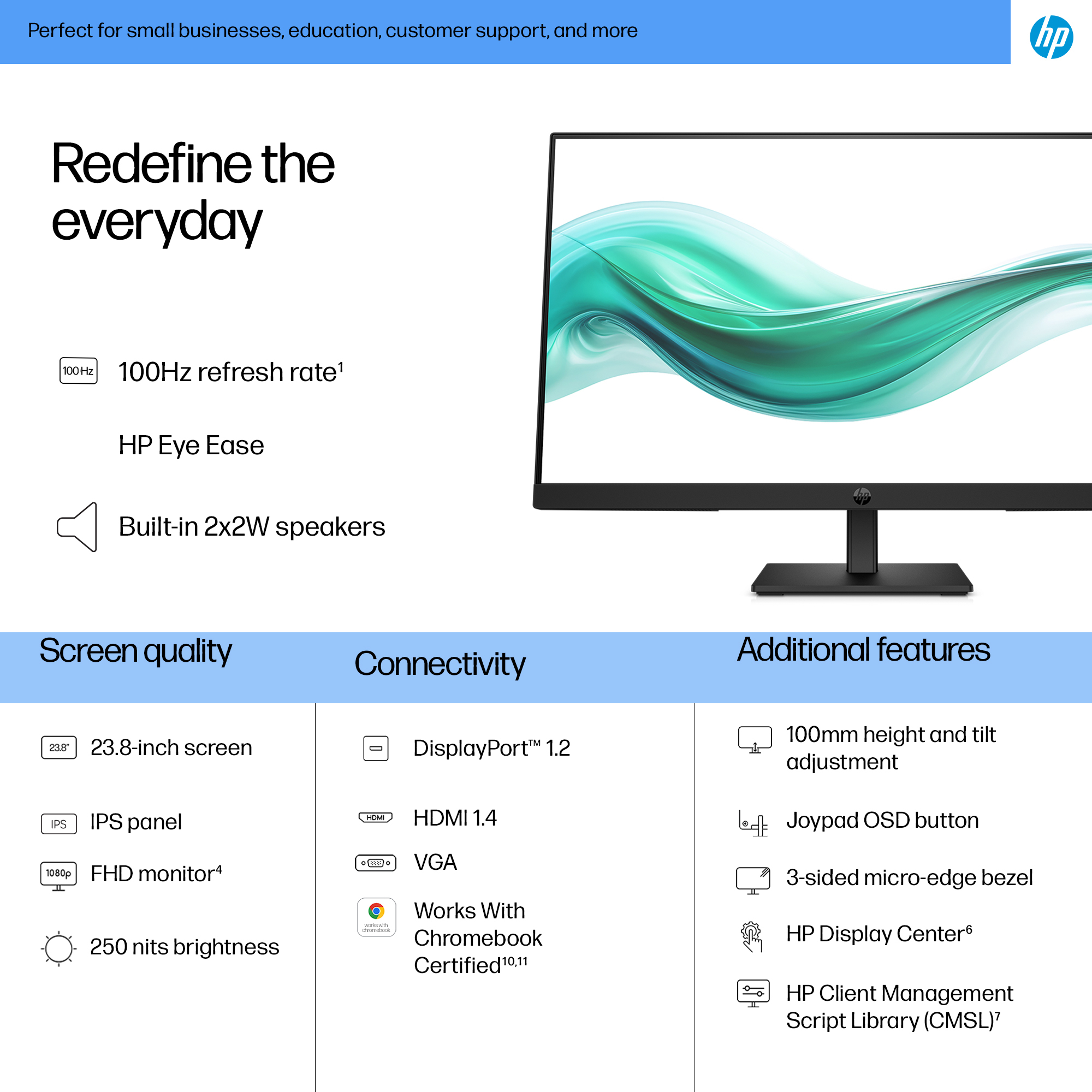 - 23.8 inch Full HD (1920 x 1080) IPS panel delivers sharp, vibrant images with wide viewing angles for collaborative workspaces.