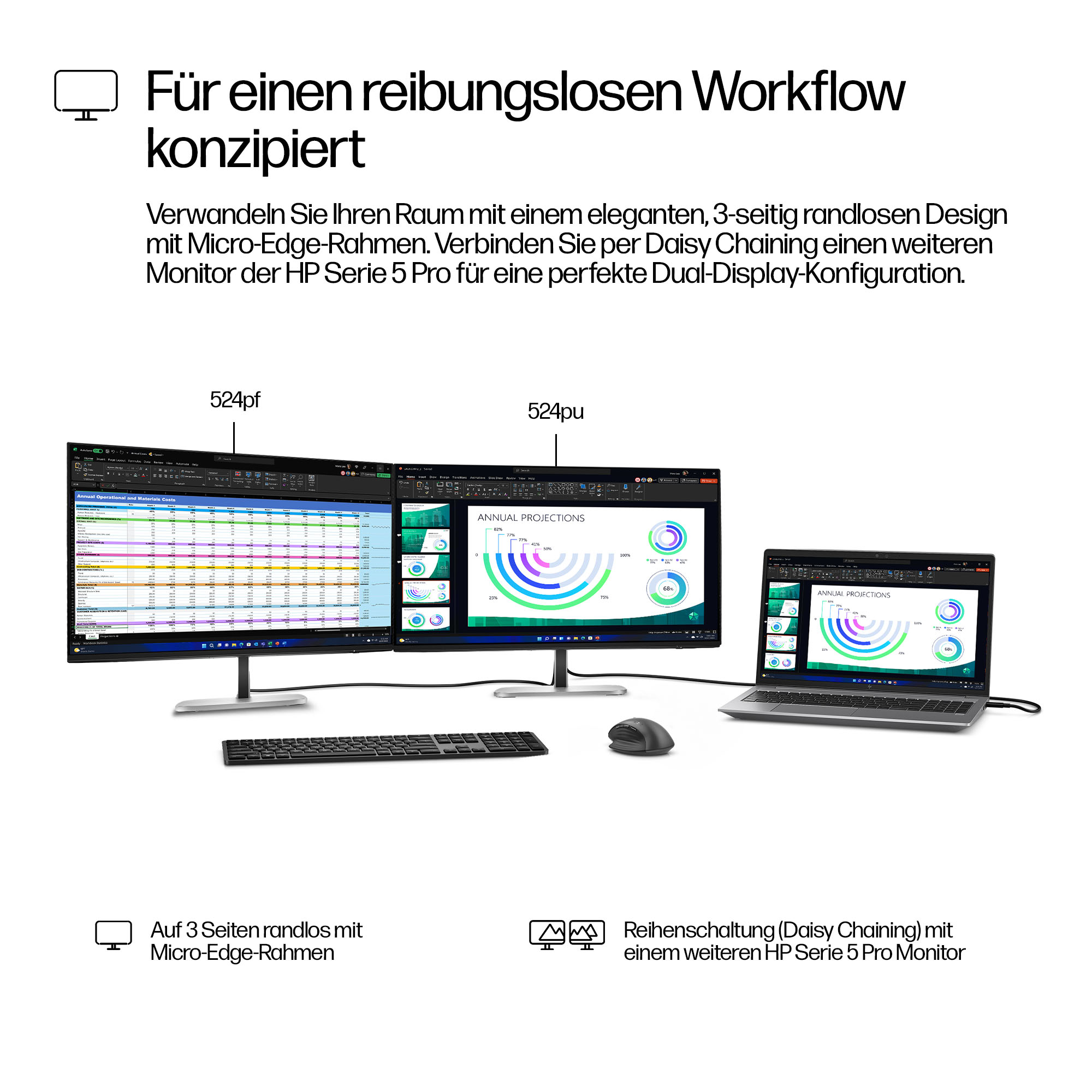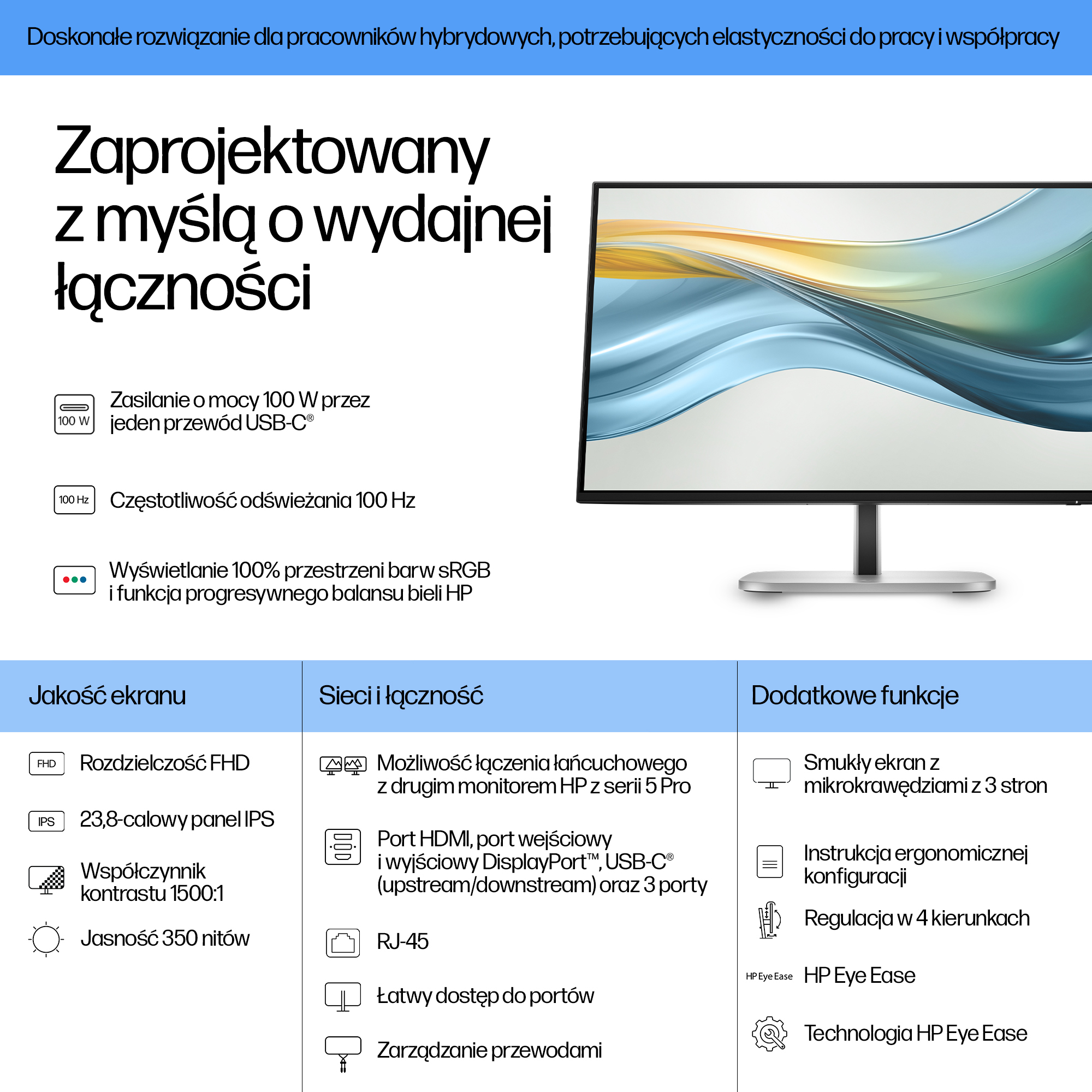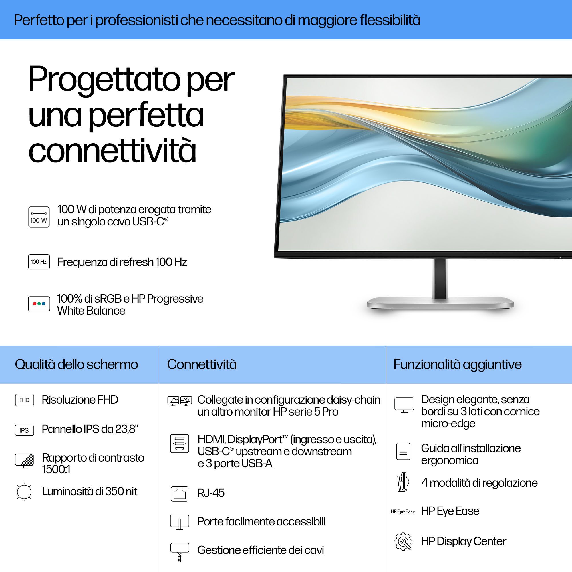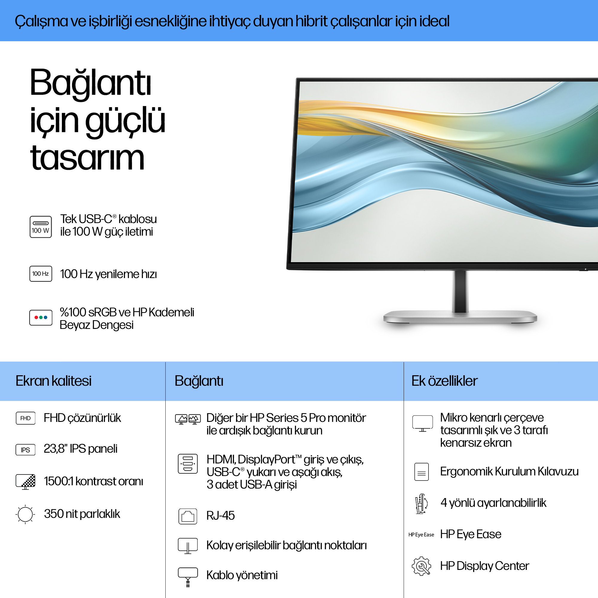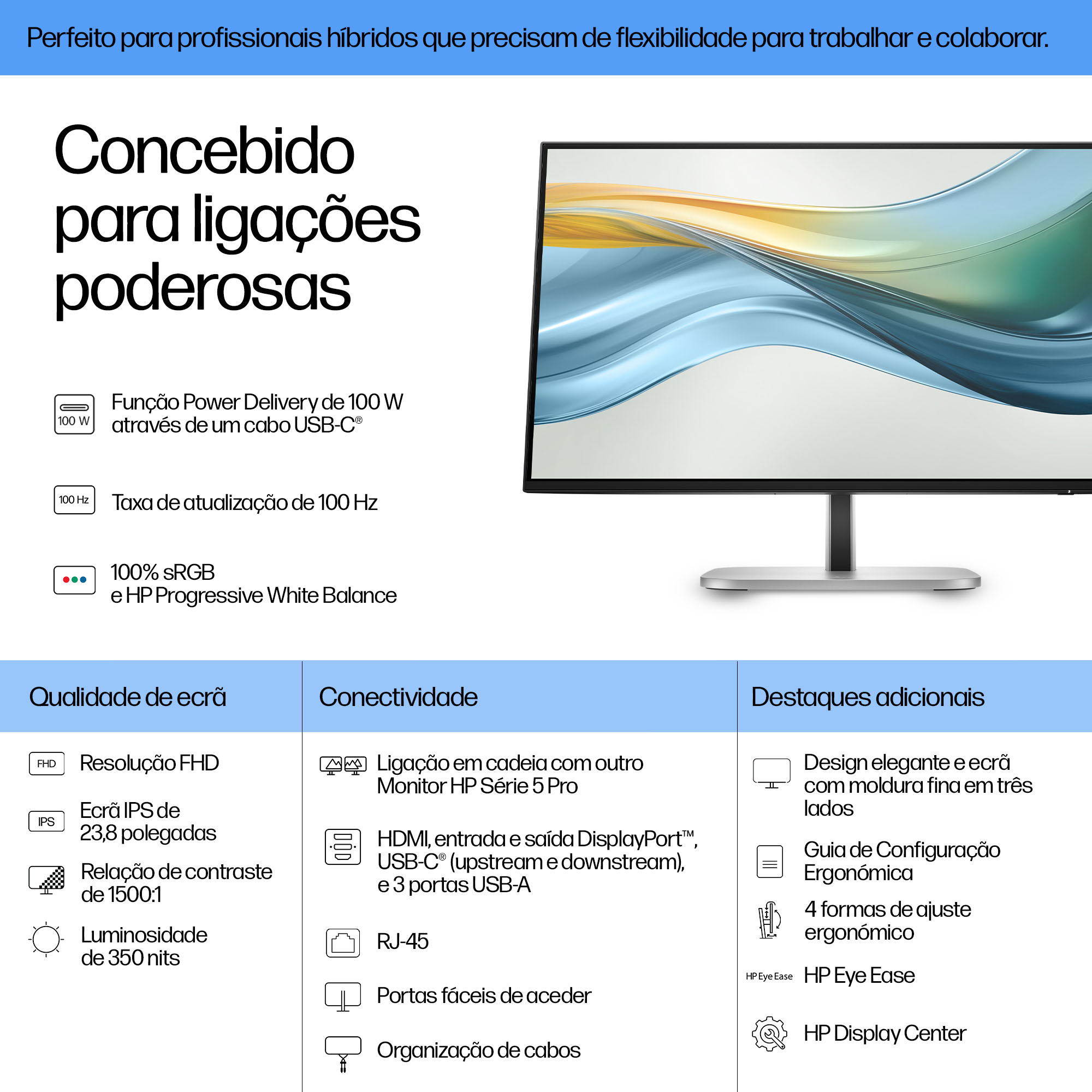 The HP Series 5 Pro 23.8 inch FHD USB-C Monitor – 524pu computer monitor features a sleek, minimalist design with narrow bezels that maximise screen real estate and create a modern, professional look. Its matte black finish complements any office décor, while the ergonomic stand ensures user comfort throughout the workday. The compact footprint makes it ideal for both individual desks and shared workspaces.