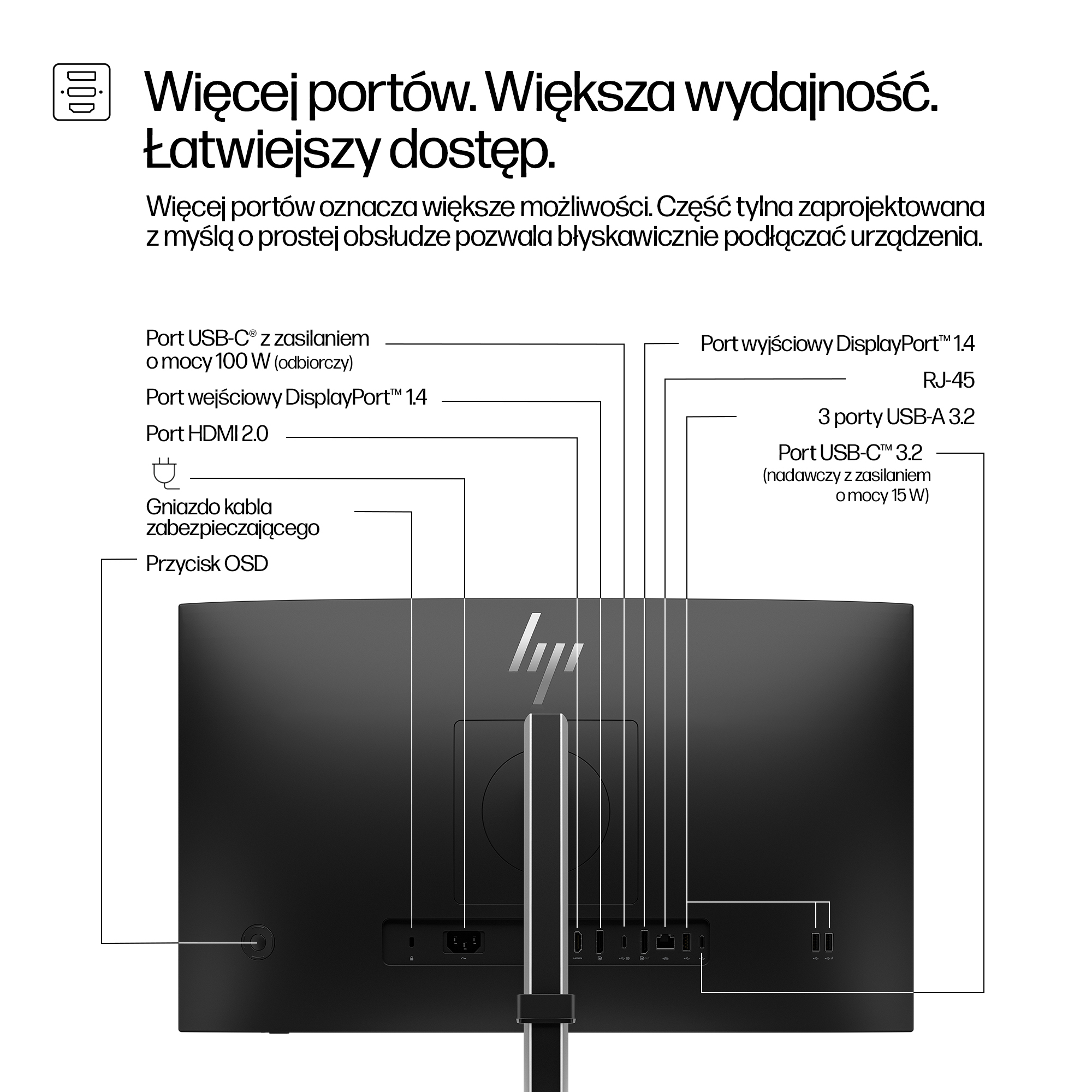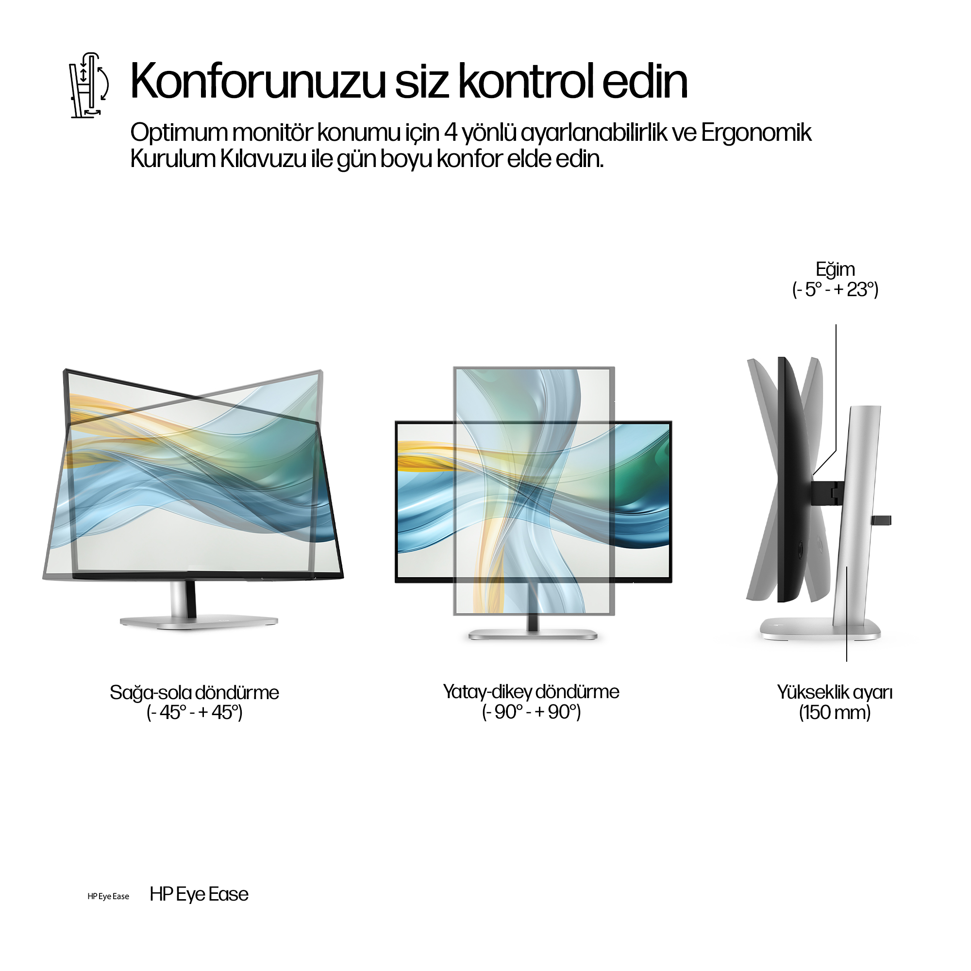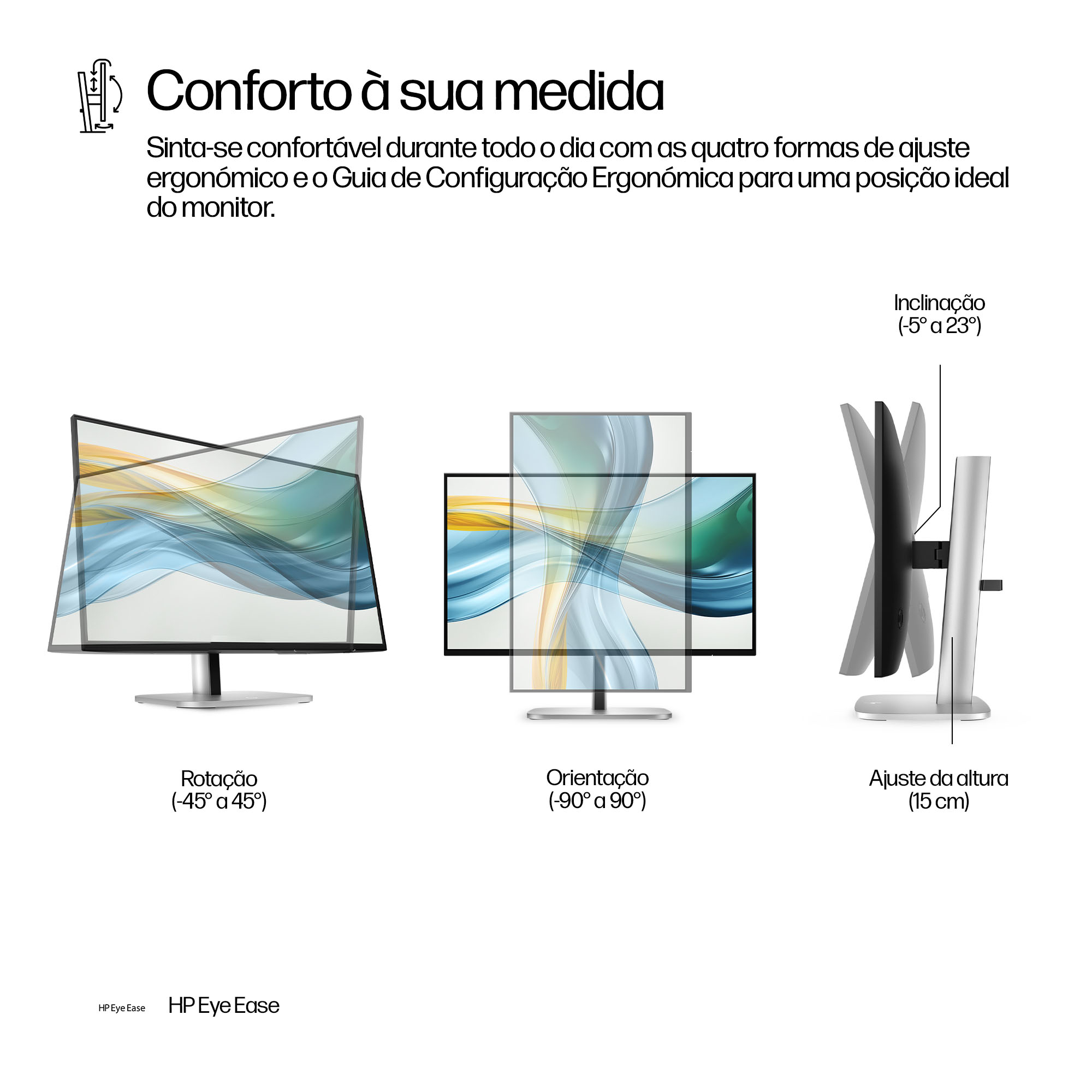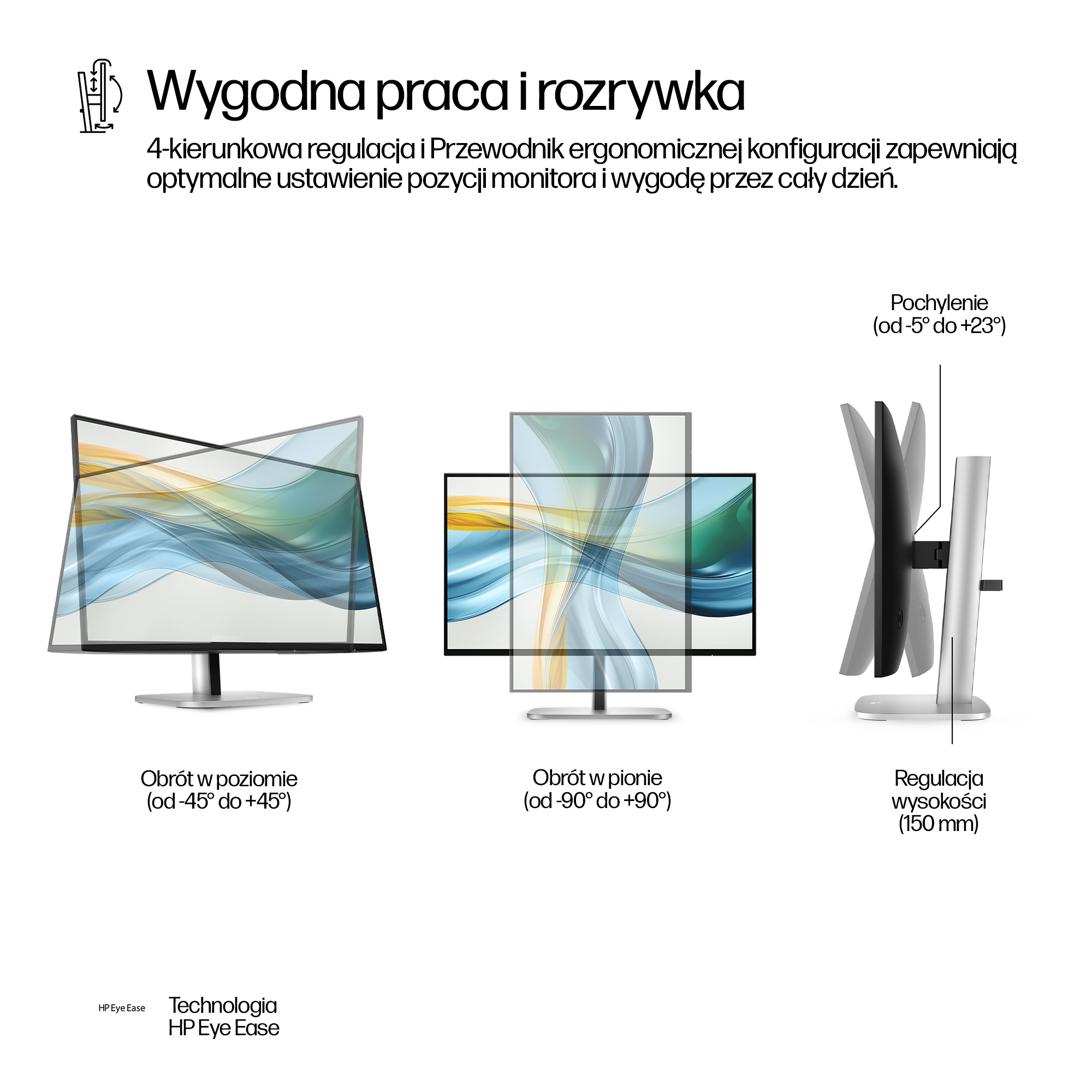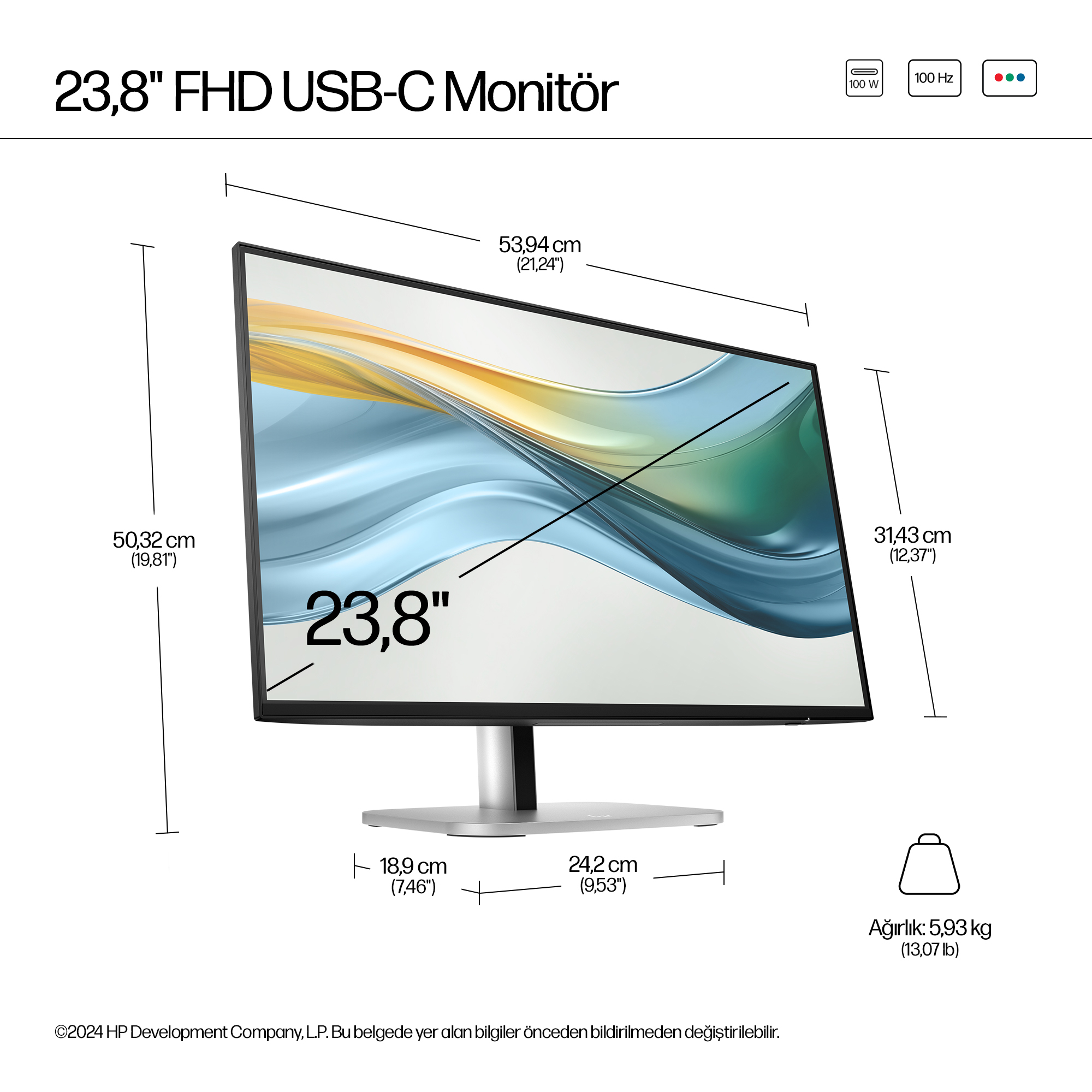The HP Series 5 Pro 23.8 inch FHD USB-C Monitor – 524pu computer monitor features a sleek, minimalist design with narrow bezels that maximise screen real estate and create a modern, professional look. Its matte black finish complements any office décor, while the ergonomic stand ensures user comfort throughout the workday. The compact footprint makes it ideal for both individual desks and shared workspaces.
