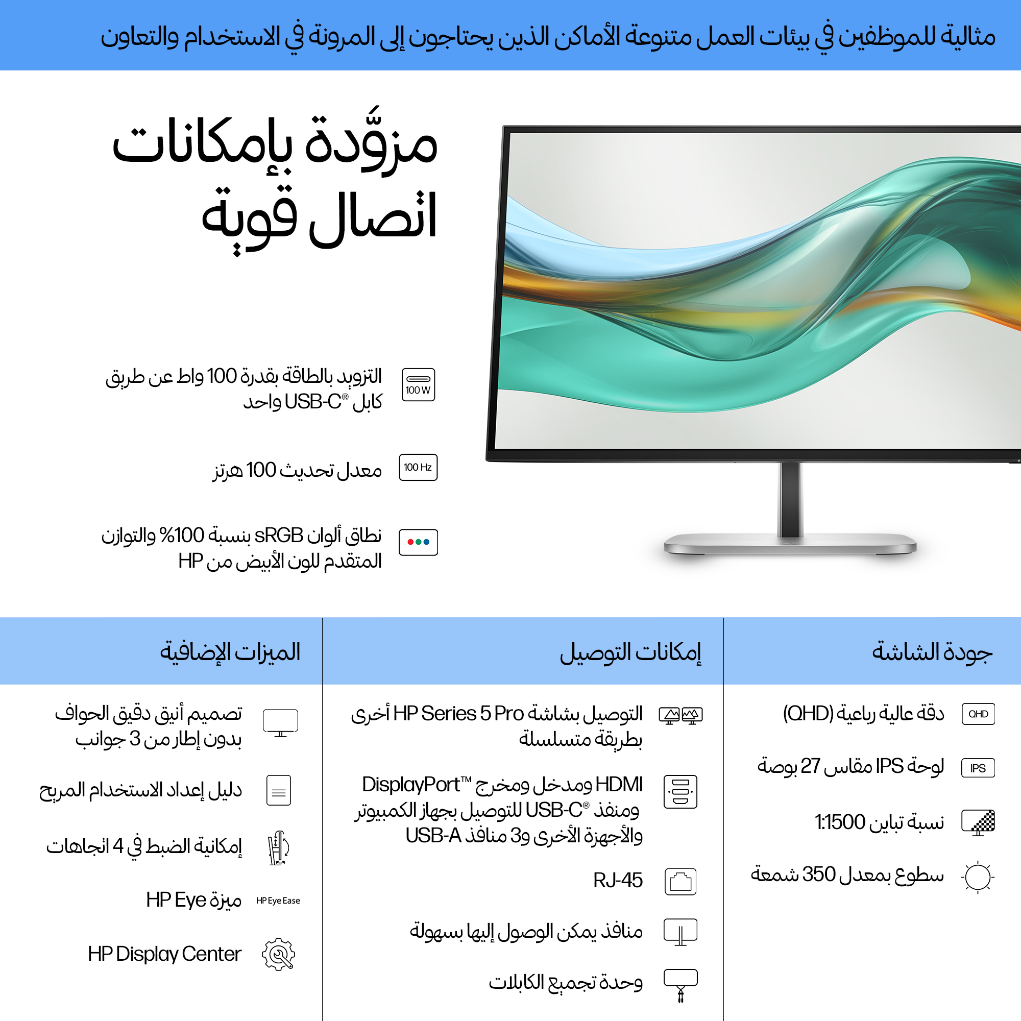 - Integrated low blue light and flicker-free technology reduce eye strain, enhancing employee wellbeing and productivity.