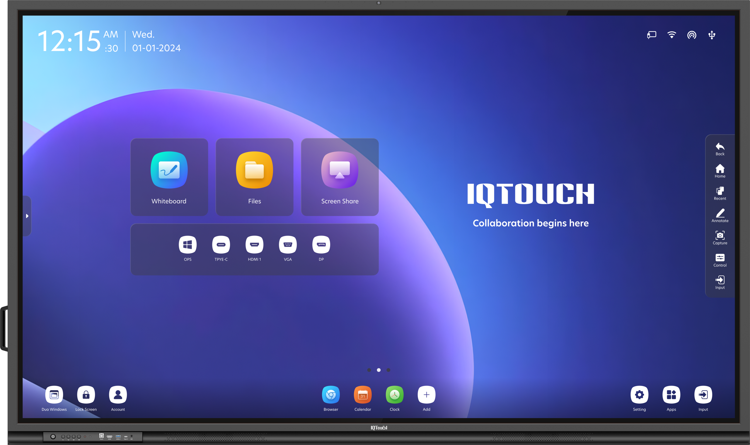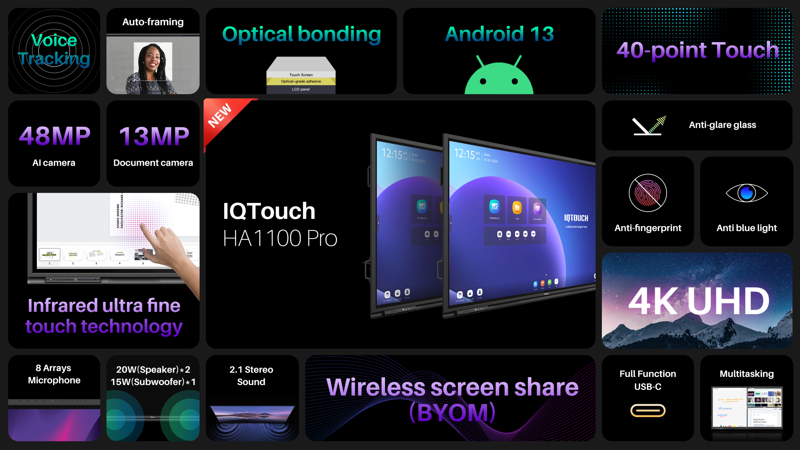 The IQTouch H-SERIES HA1100 PRO boasts a sleek, modern design with ultra-thin bezels that maximise screen real estate. Its robust build quality ensures durability in high-traffic meeting rooms and collaborative spaces. The anti-glare glass surface provides excellent visibility under various lighting conditions, while the intuitive interface offers a smooth and responsive touch experience. This combination of aesthetics and functionality makes it a standout choice for professional environments.