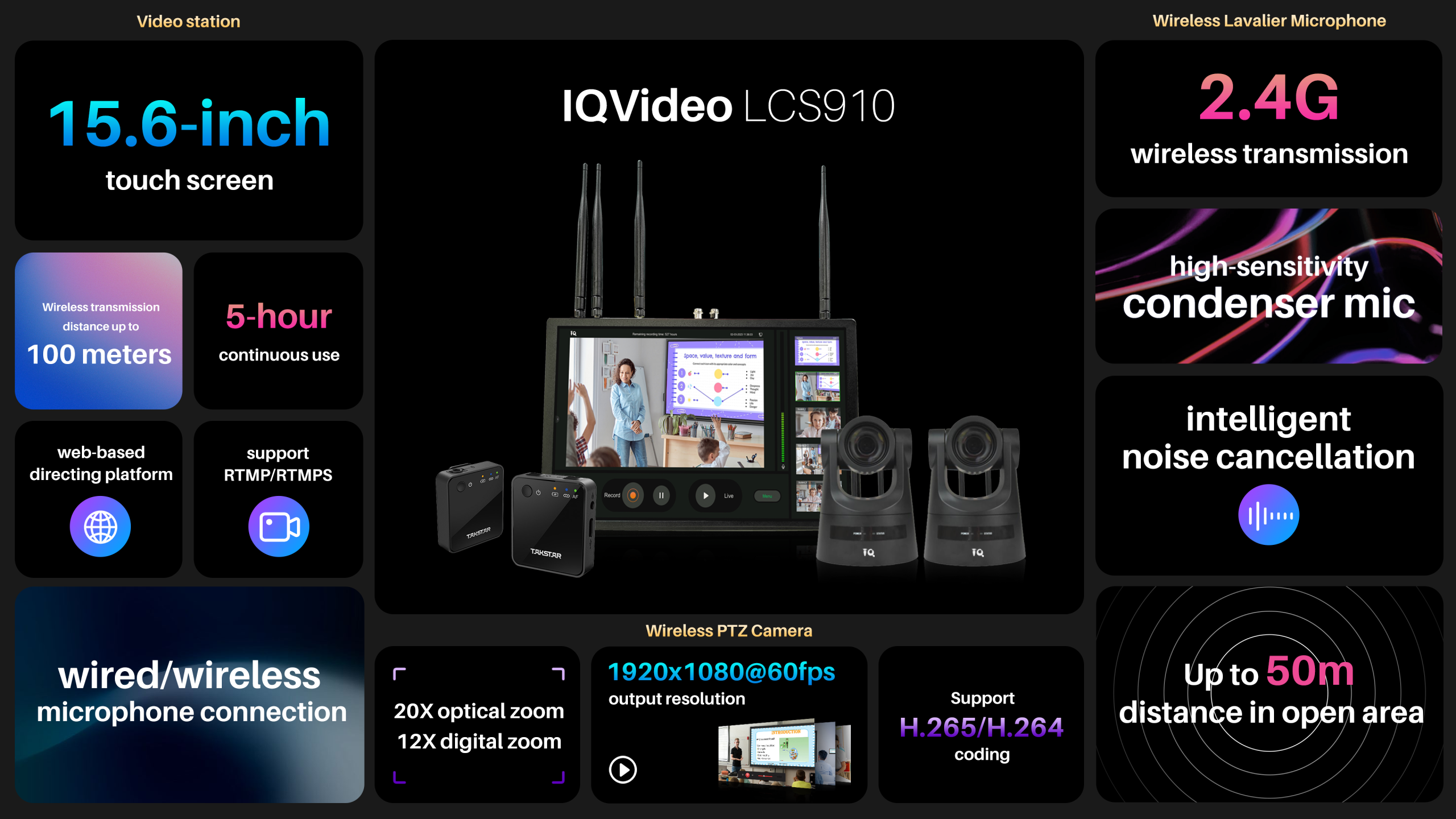 The IQTouch IQVideo LCS910 Portable Lecture Capture System features a sleek, compact design that balances portability with durability. Its intuitive interface allows quick operation, reducing setup time and technical barriers. The professional aesthetic fits well in corporate, educational, and training environments, reflecting a modern approach to hybrid work solutions.