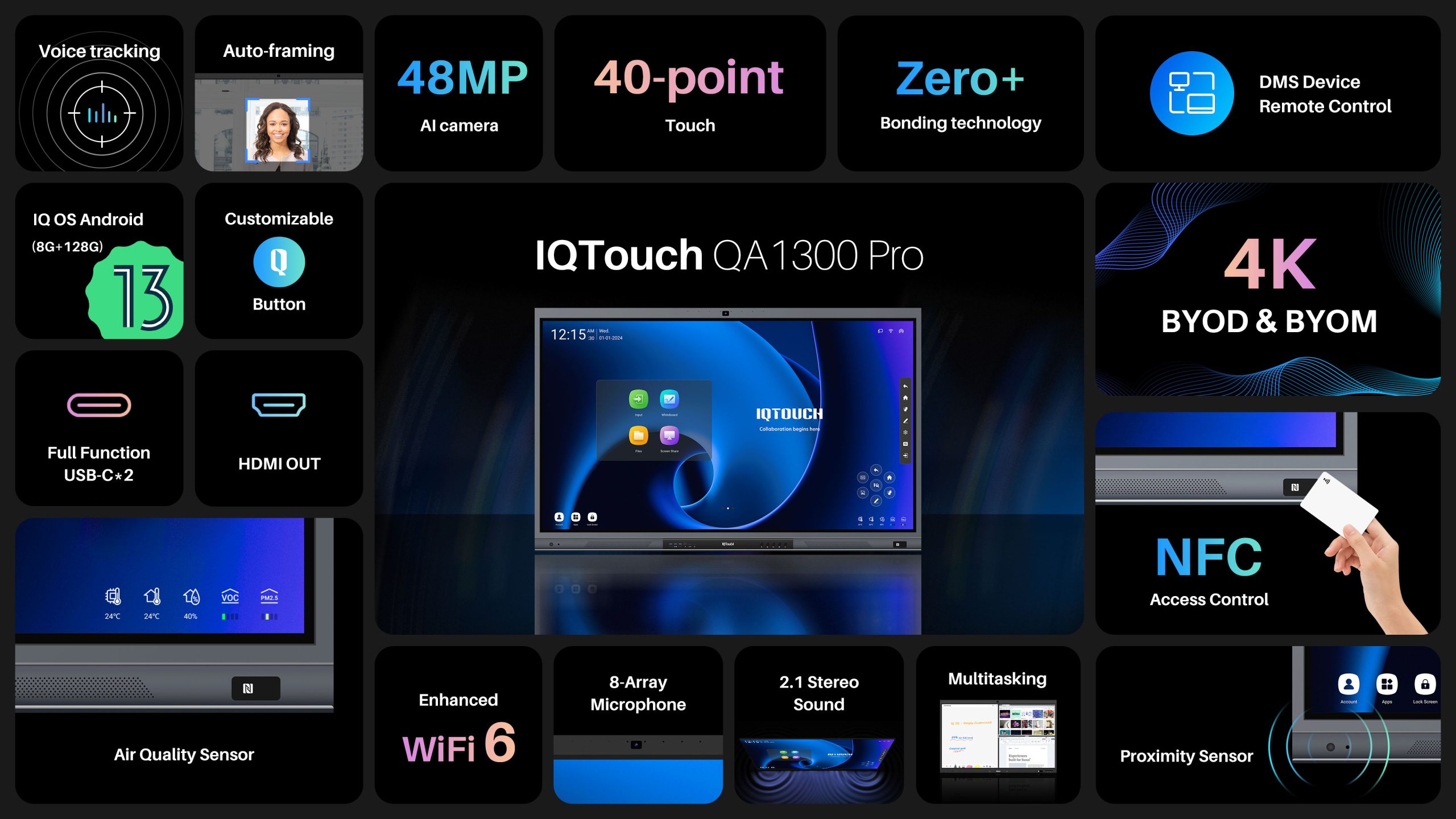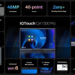 - The IQTOUCH Q-SERIES QA1300 Pro features an anti-glare, anti-fingerprint glass surface, ensuring clear visibility and durability in busy office environments.