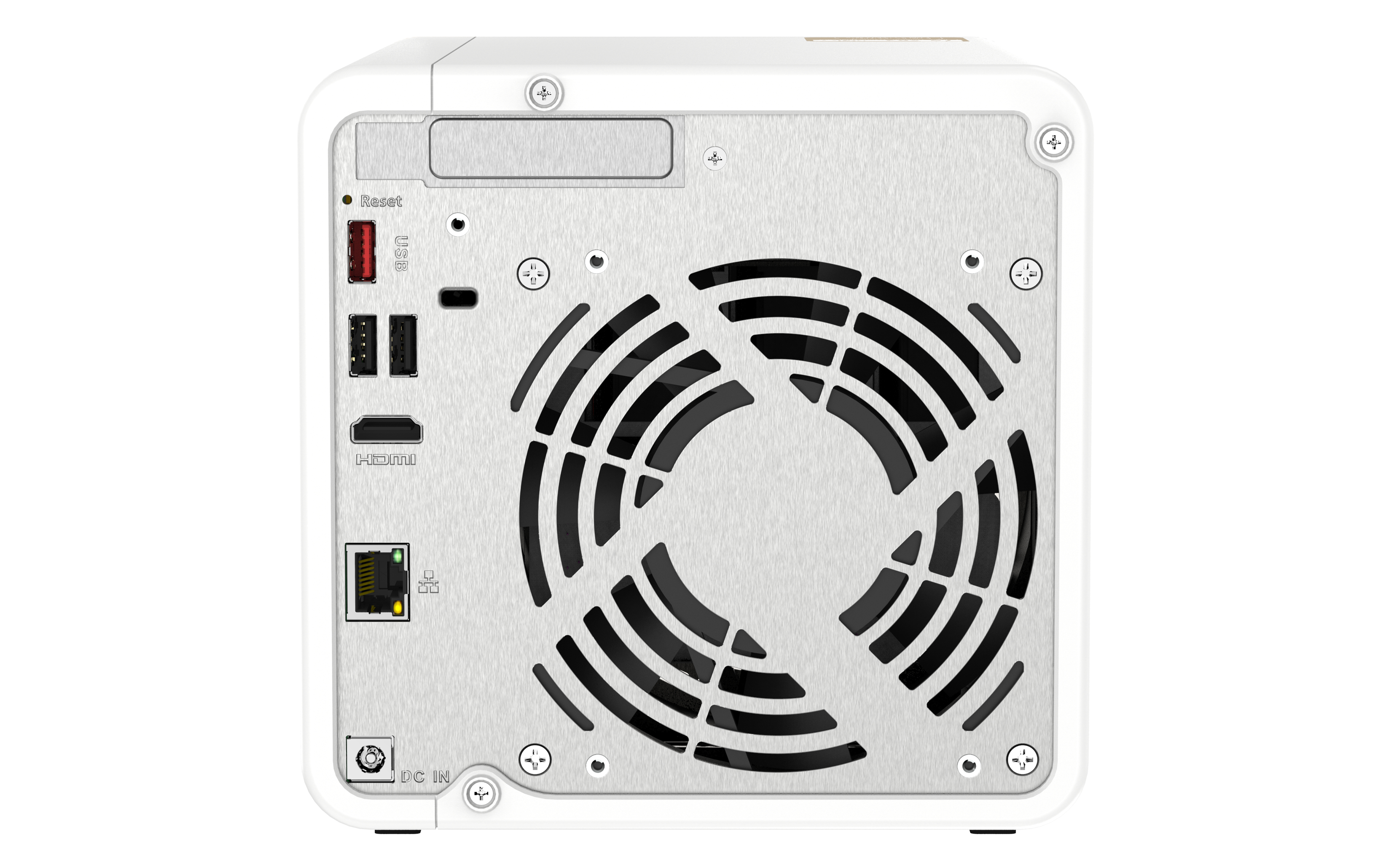 - Four drive bays supporting both HDD and SSD, enabling flexible storage expansion and high-speed caching.
