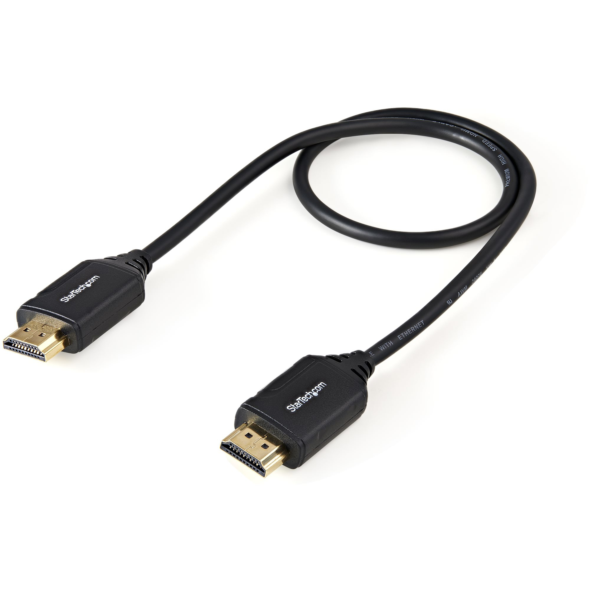 The StarTech.com HDMM50CMP HDMI cable features a sleek black jacket with flexible yet robust insulation, designed to withstand frequent handling and installation adjustments. Its connectors are ergonomically designed for easy insertion and removal, ensuring a secure fit without damaging ports. The cable’s professional appearance complements any office or meeting room environment, reinforcing a polished and efficient workspace.