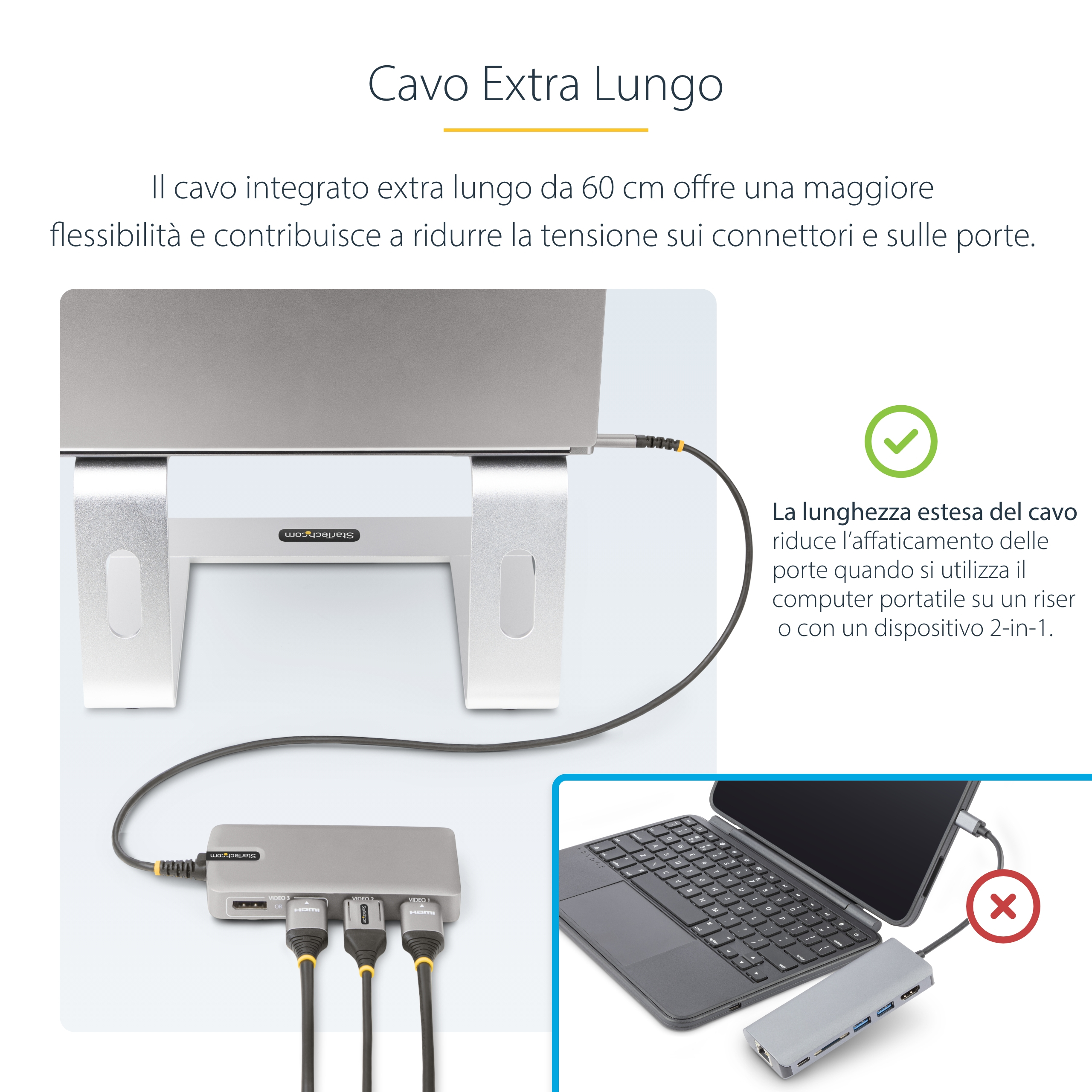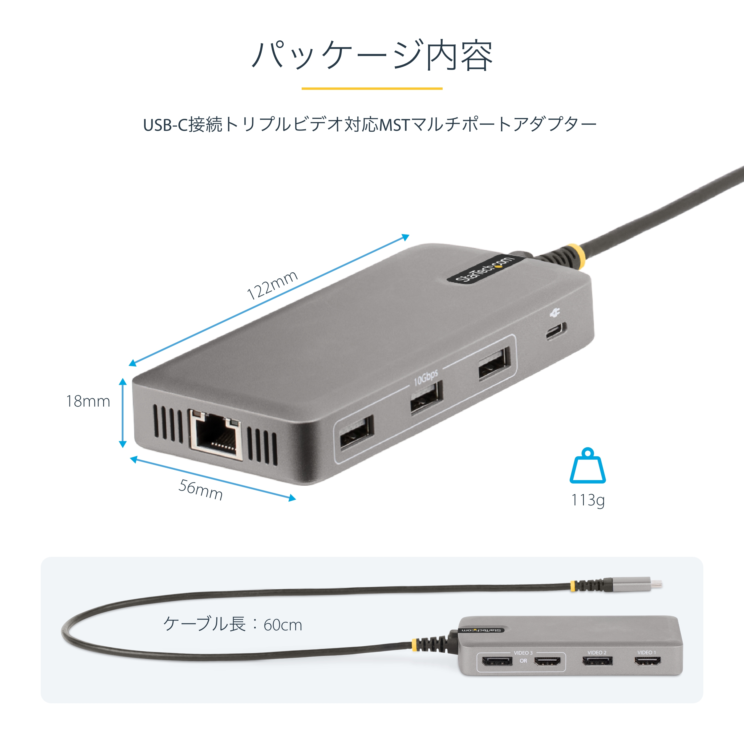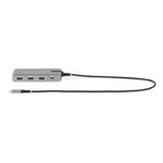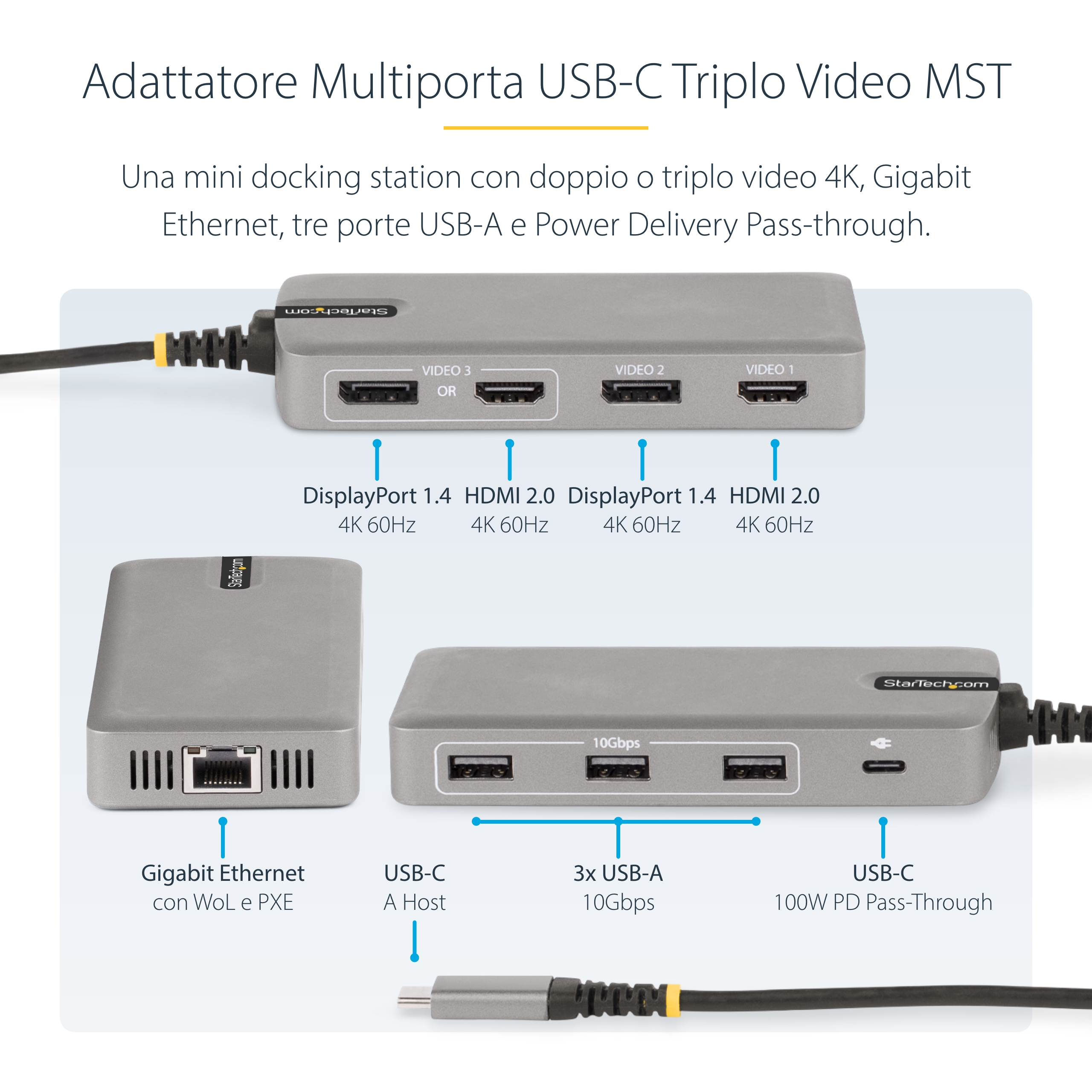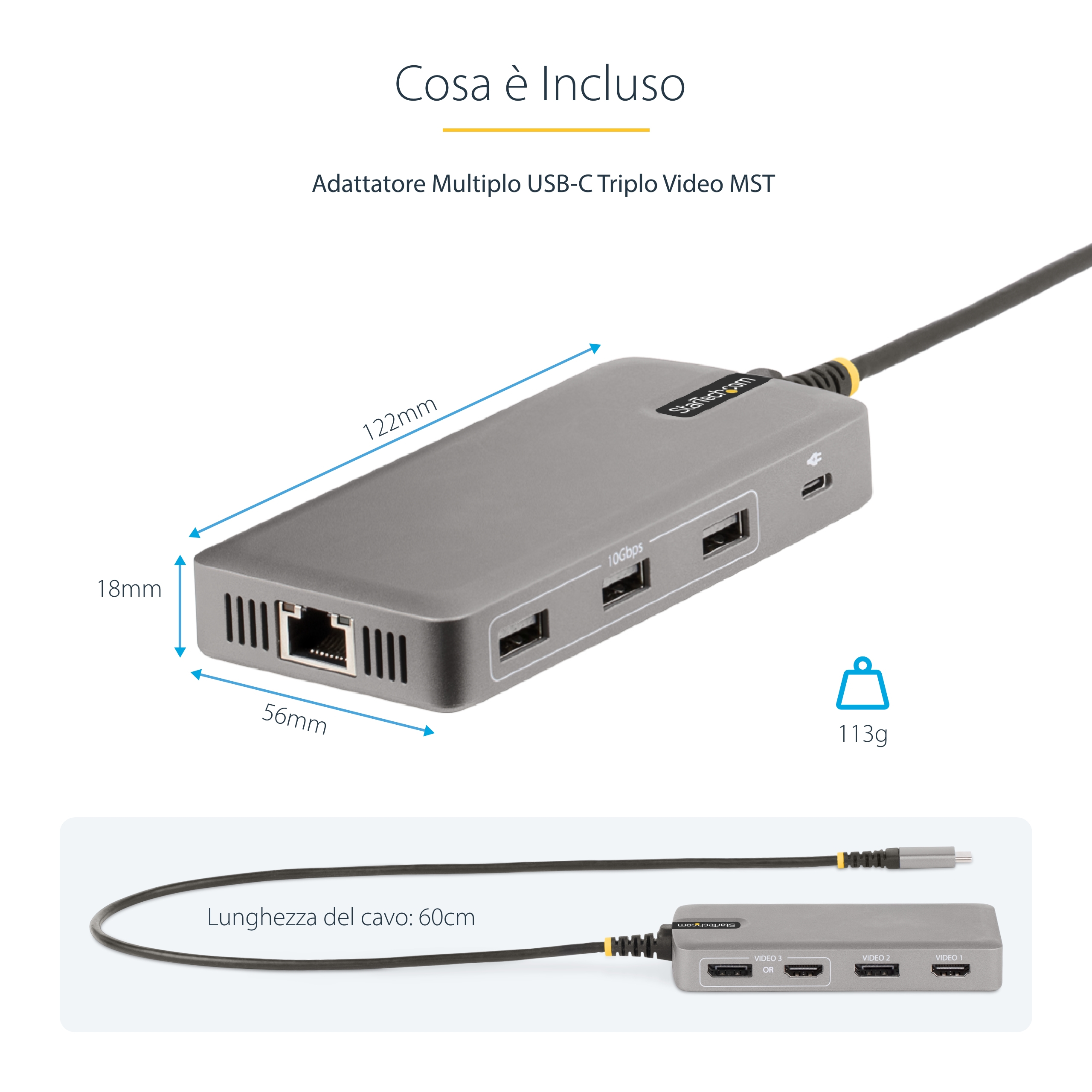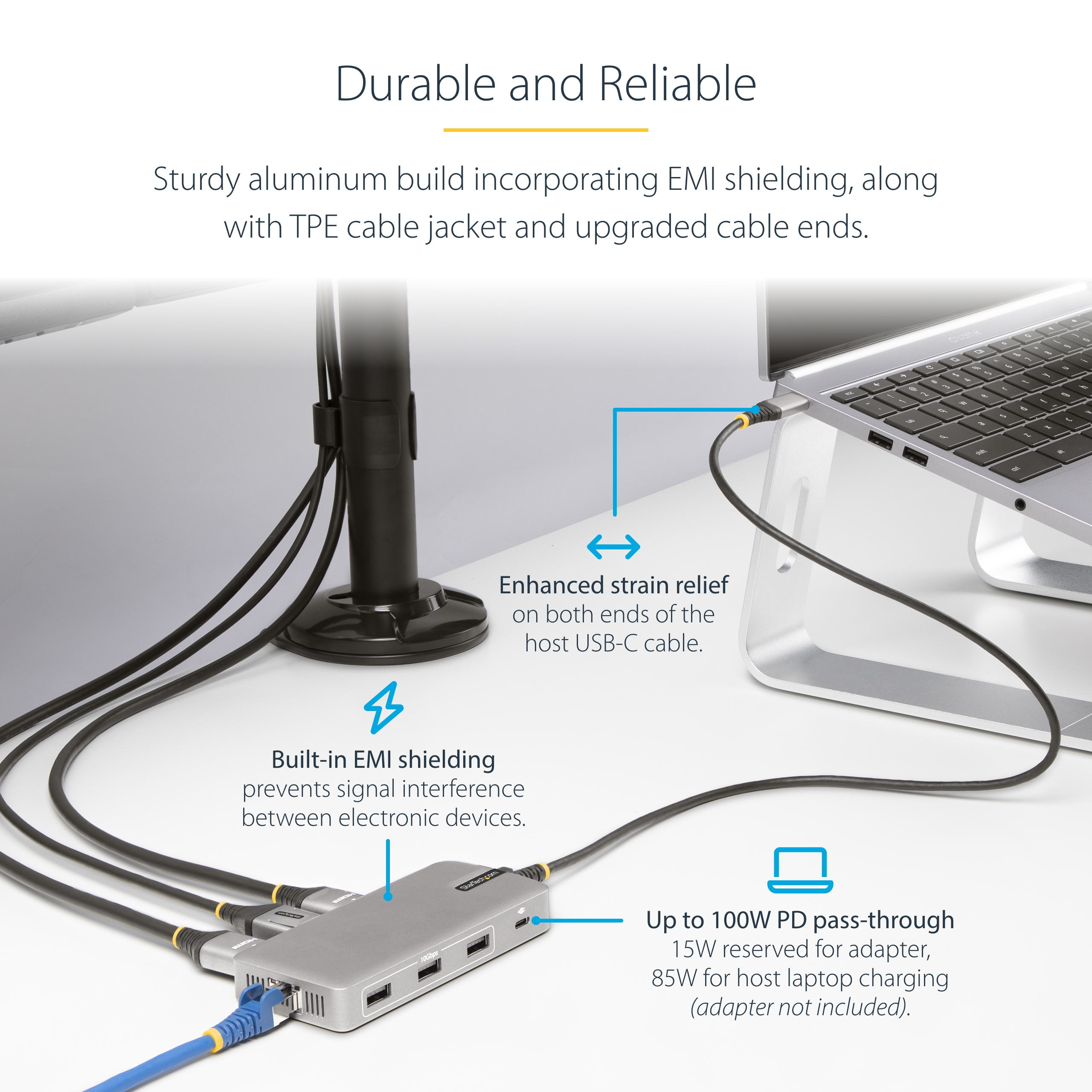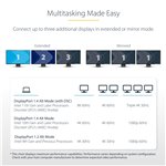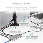 The StarTech.com 117B-USBC-MULTIPORT laptop dock/port replicator features a sleek, matte black finish that complements professional office settings. Its compact footprint fits easily on desks without overwhelming workspace. The sturdy build ensures durability for daily use, while intuitive port placement allows effortless cable management and quick access to connections.
