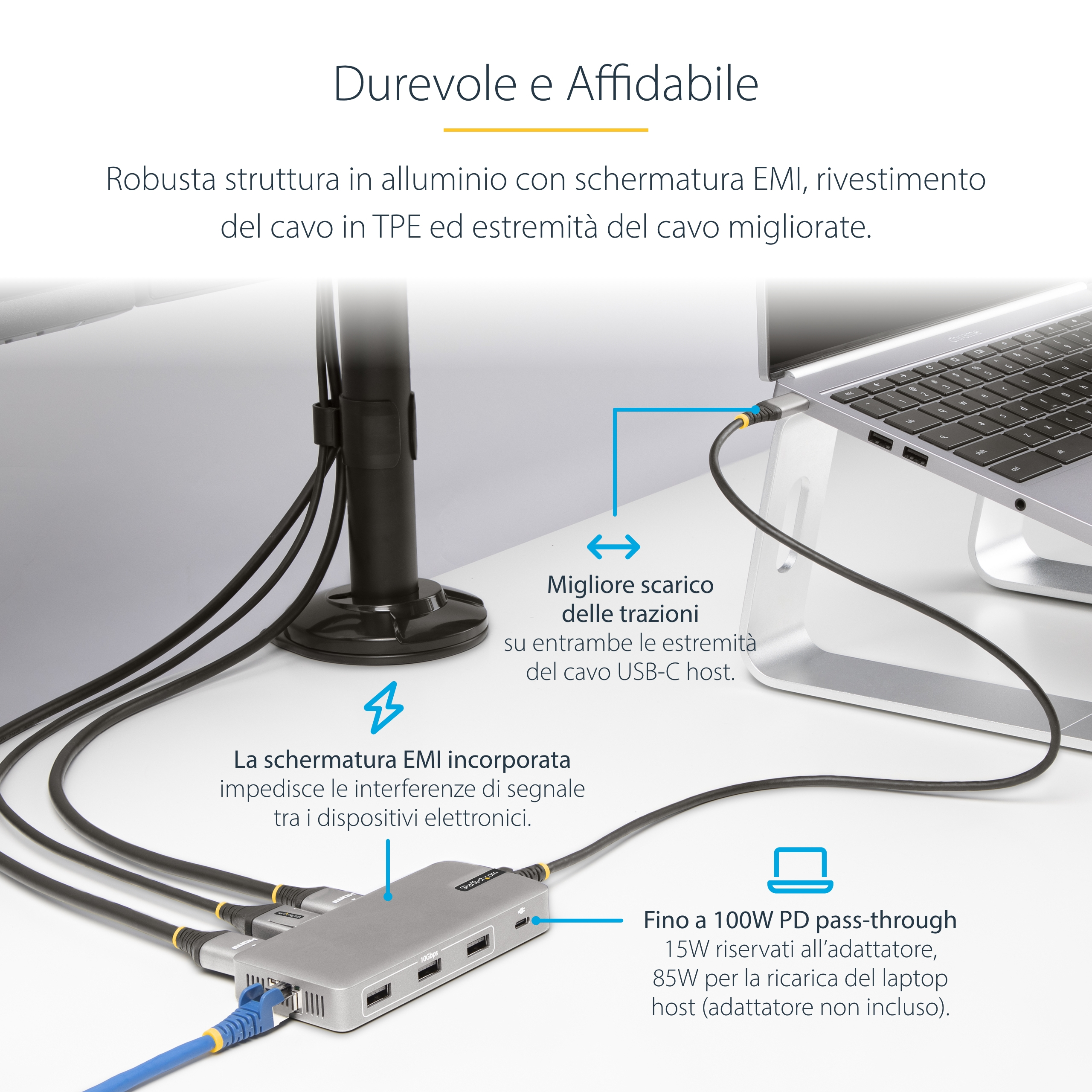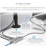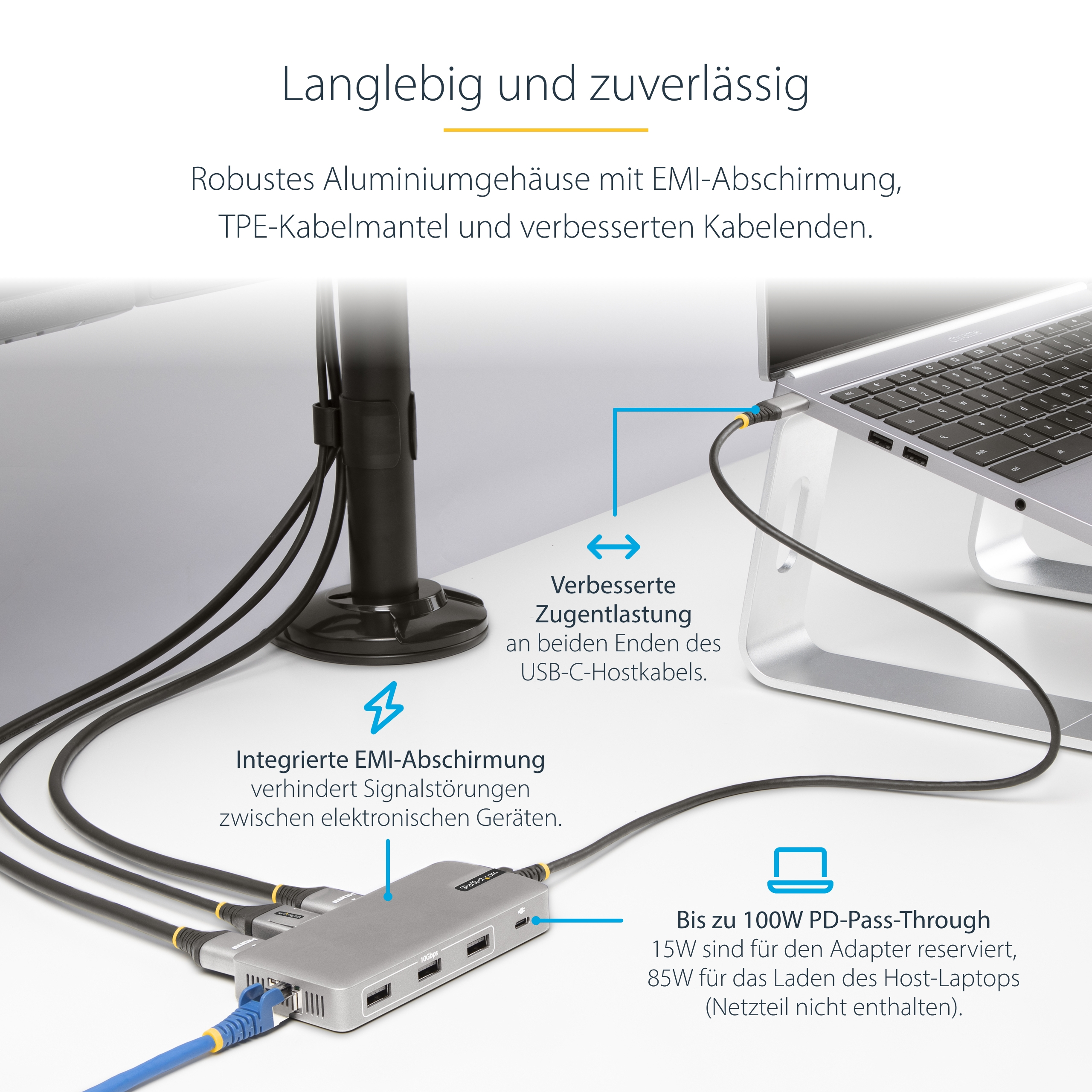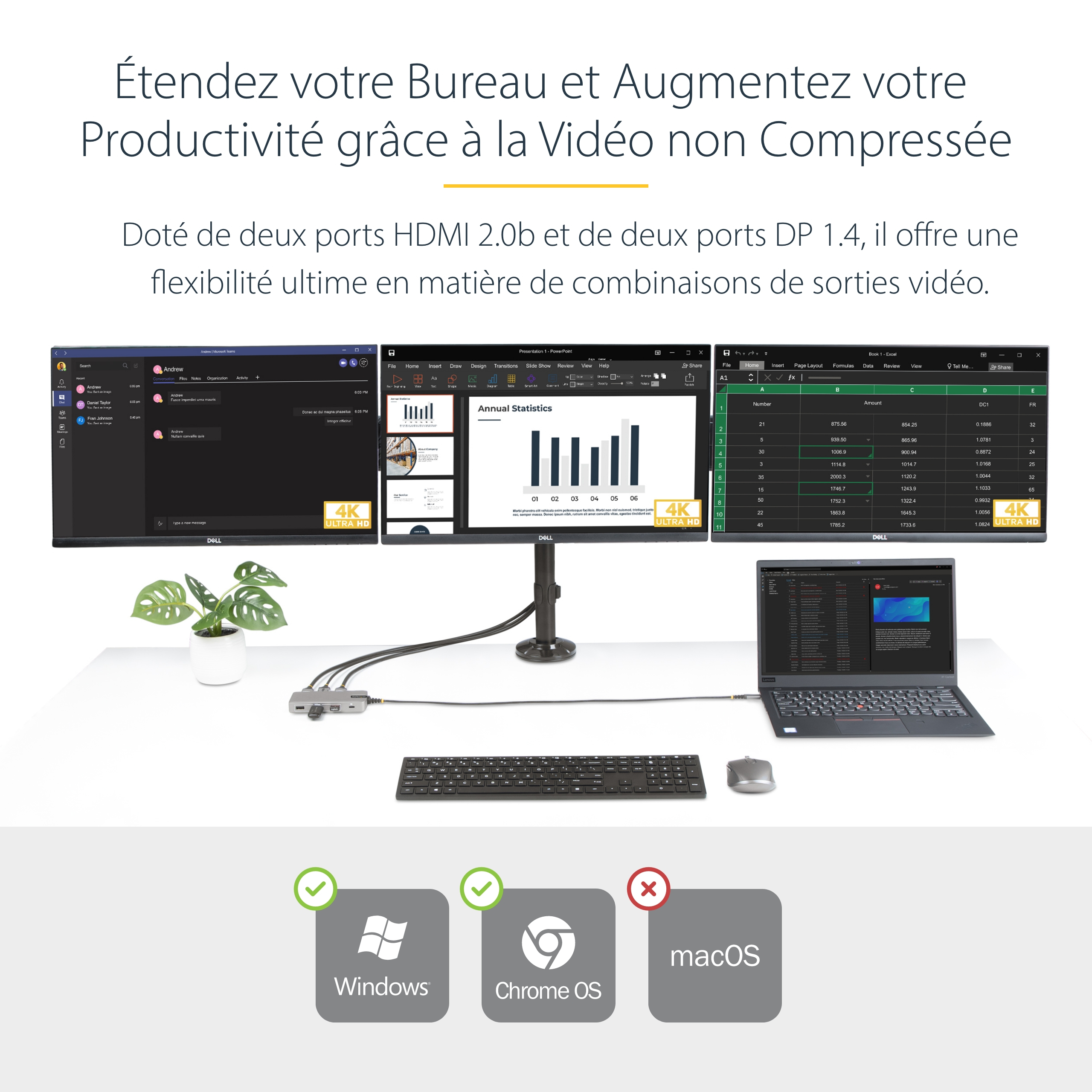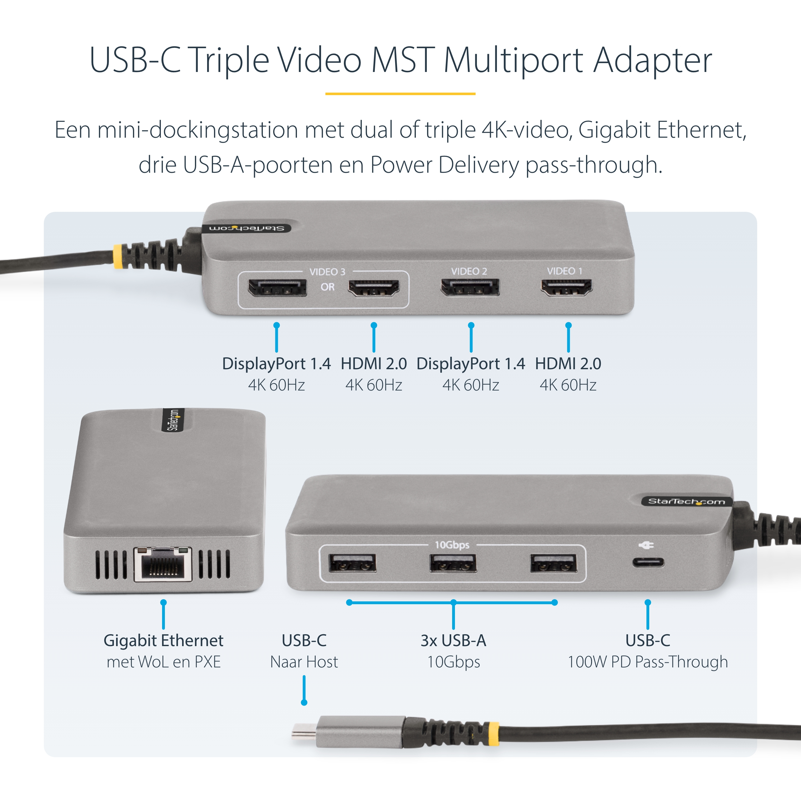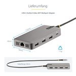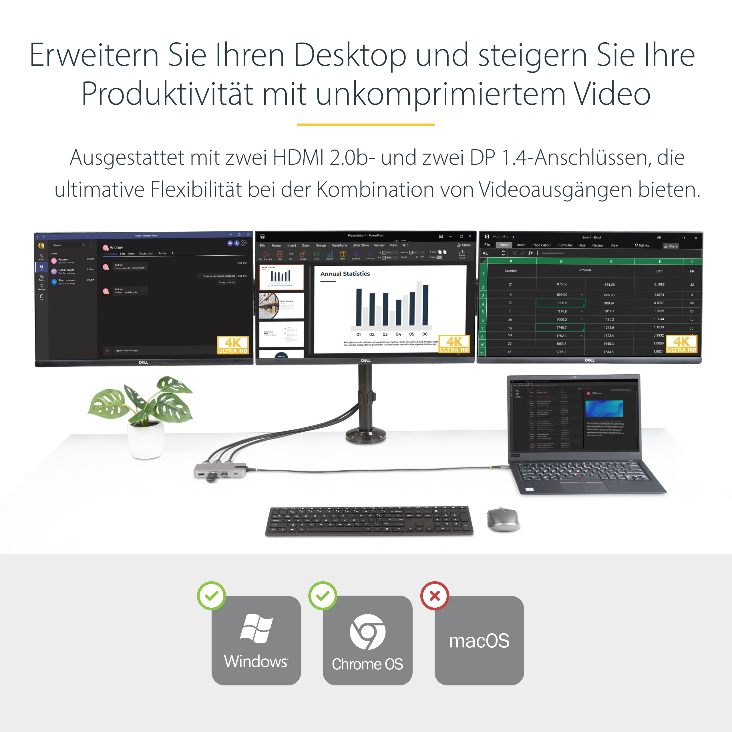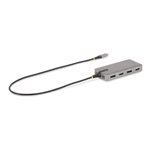 The StarTech.com 117B-USBC-MULTIPORT laptop dock/port replicator features a sleek, matte black finish that complements professional office settings. Its compact footprint fits easily on desks without overwhelming workspace. The sturdy build ensures durability for daily use, while intuitive port placement allows effortless cable management and quick access to connections.