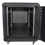 The StarTech.com RK1236BKF rack cabinet features a sleek, professional black finish that complements modern IT environments. Its robust steel frame conveys durability while maintaining a clean, organised appearance. The lockable doors and ventilated panels balance security with functionality, making it an attractive yet practical addition to any server room or data centre.