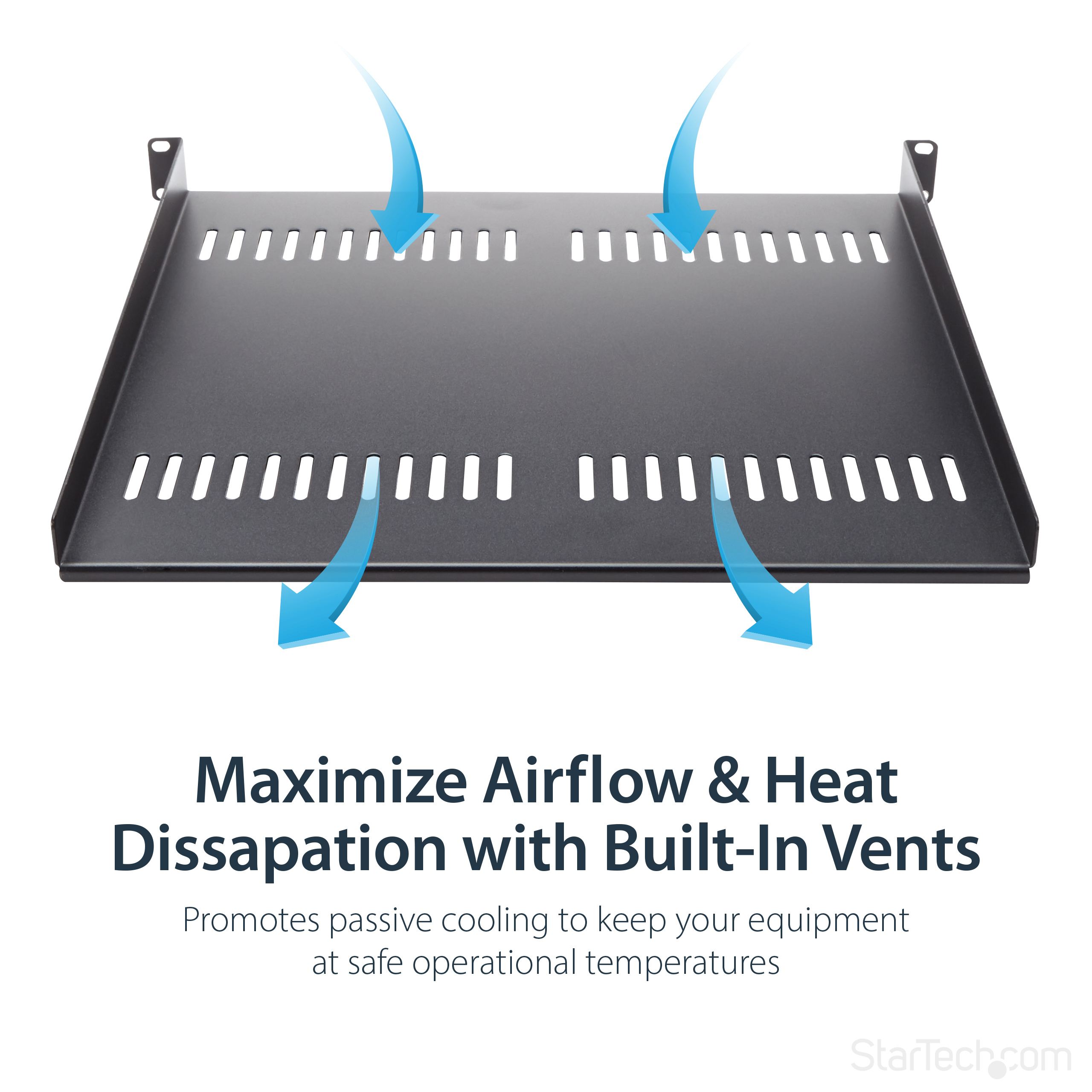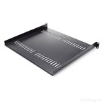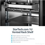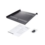 - The StarTech.com CABSHELF116V rack accessory features a robust steel frame with a black powder-coated finish, providing corrosion resistance and a professional appearance.