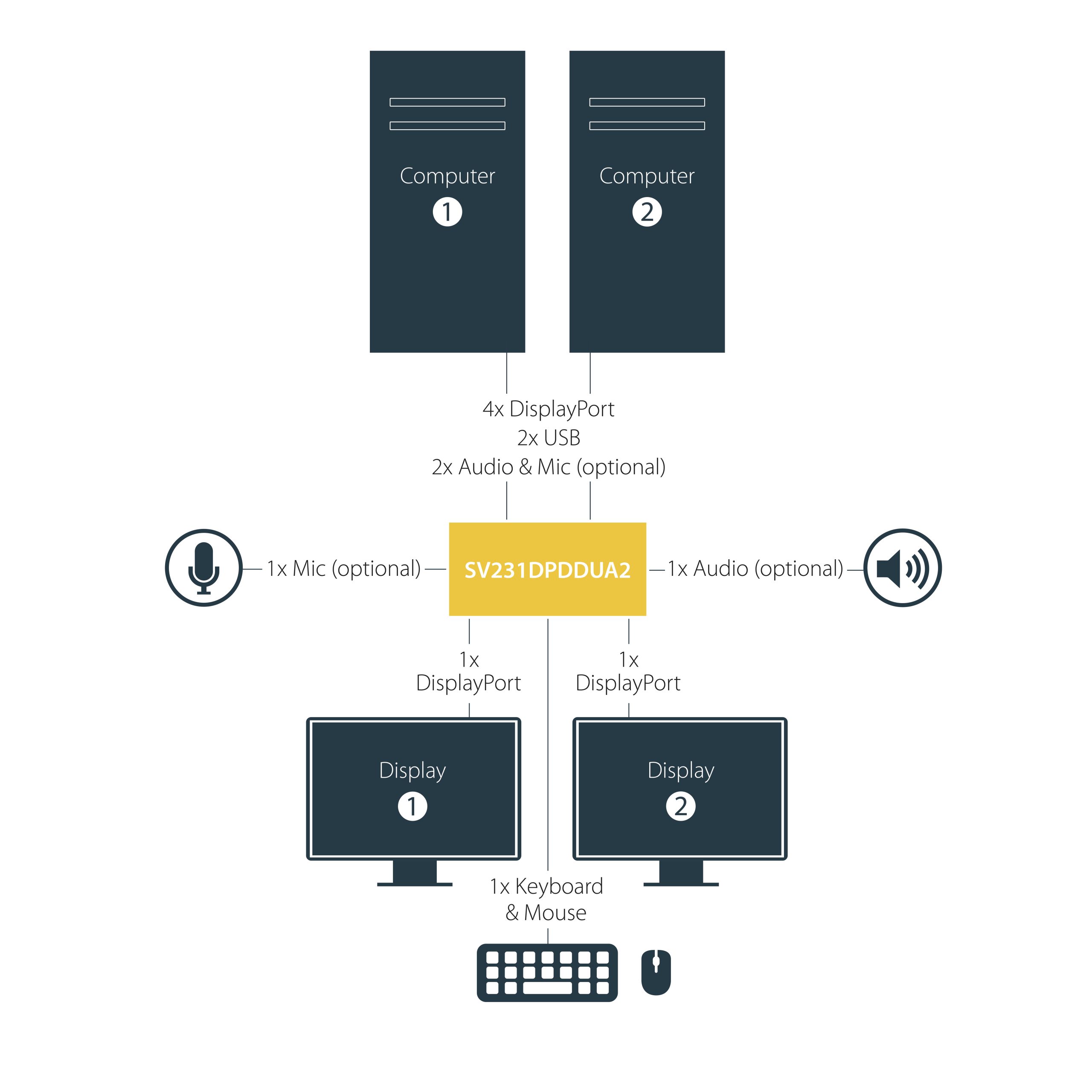 - The StarTech.com SV231DPDDUA2 KVM switch supports resolutions up to 4K UHD at 60Hz, ensuring sharp and clear display quality for detailed applications.