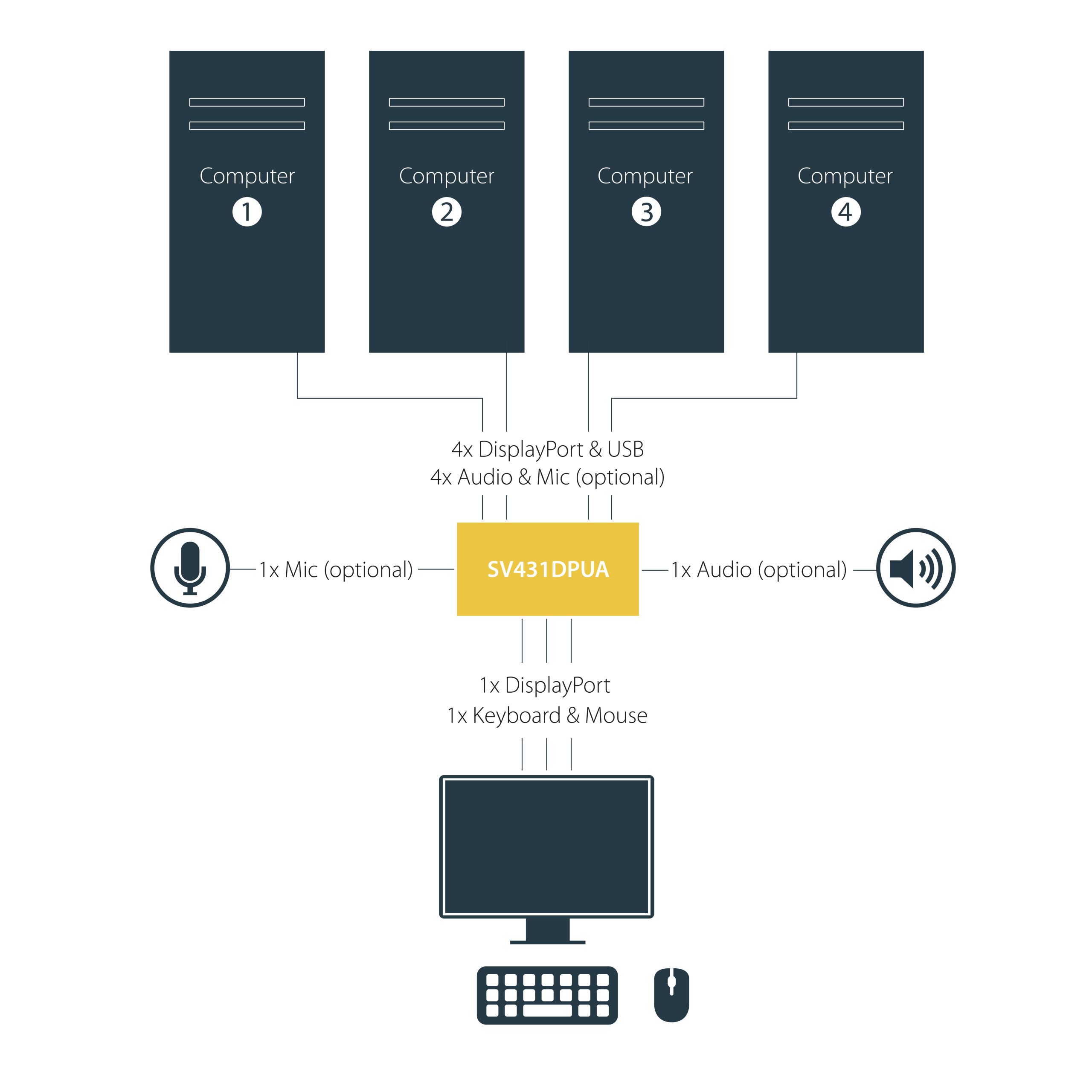 - The StarTech.com SV431DPUA KVM switch supports DisplayPort 1.2, enabling resolutions up to 4K UHD at 60Hz, ideal for high-definition applications and detailed graphical work.