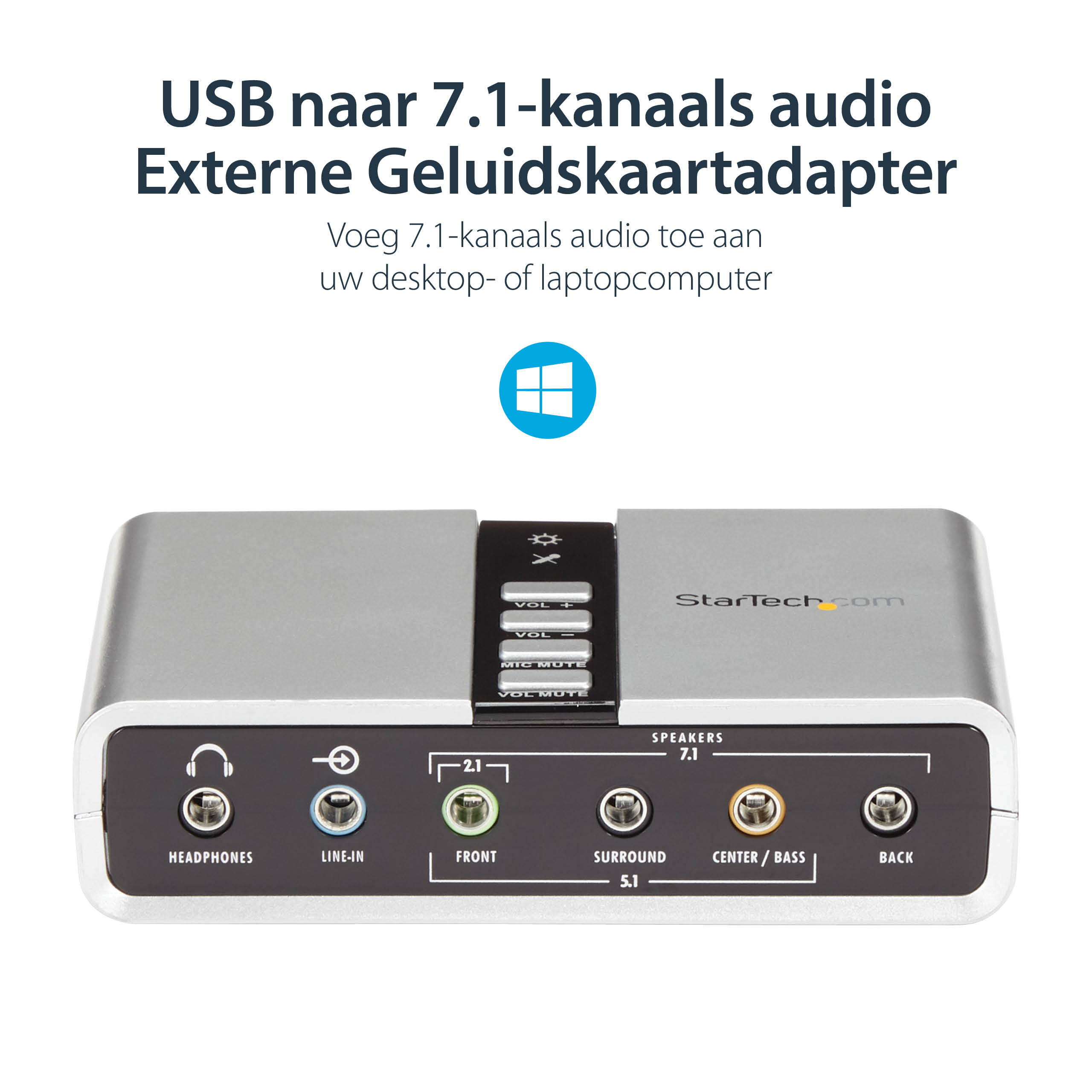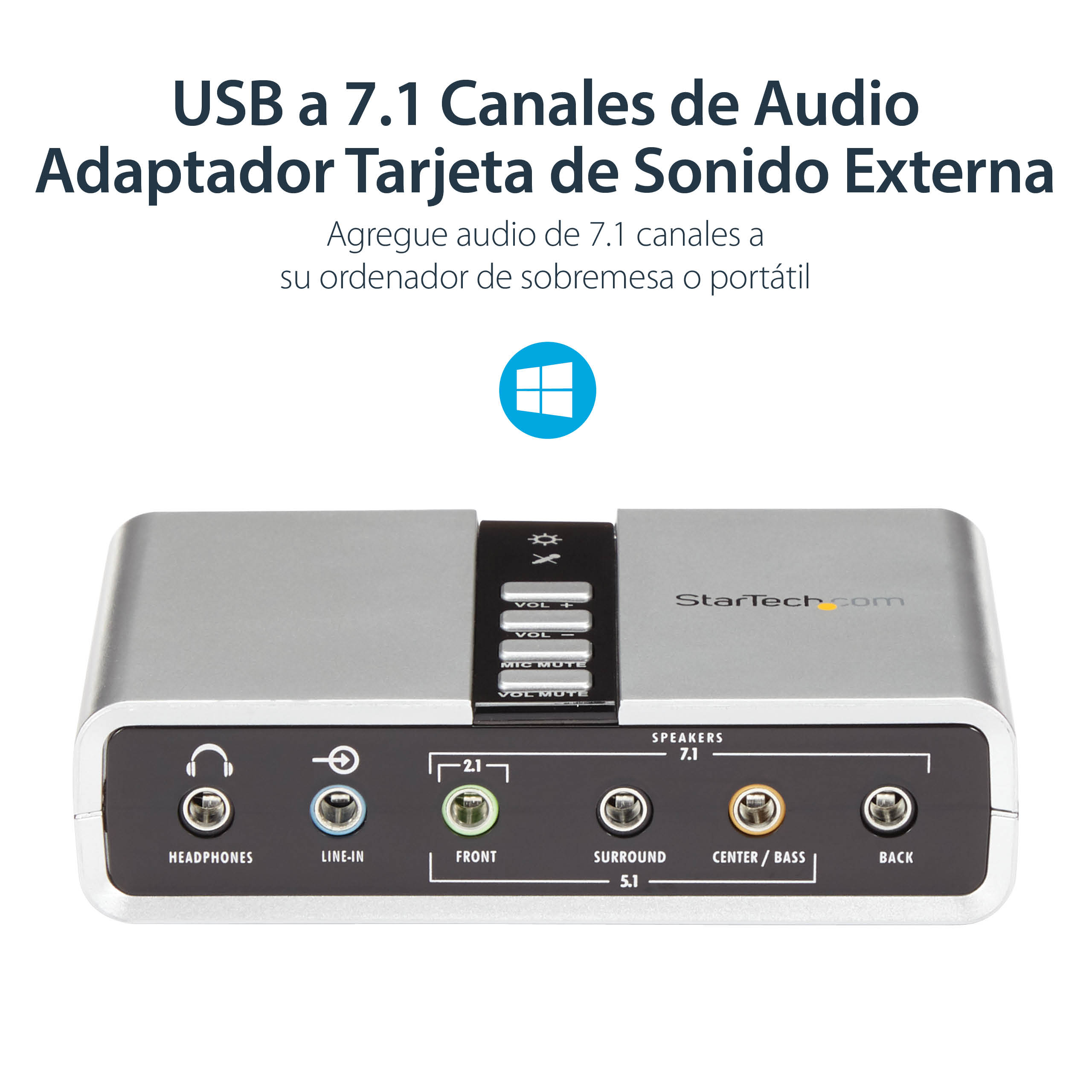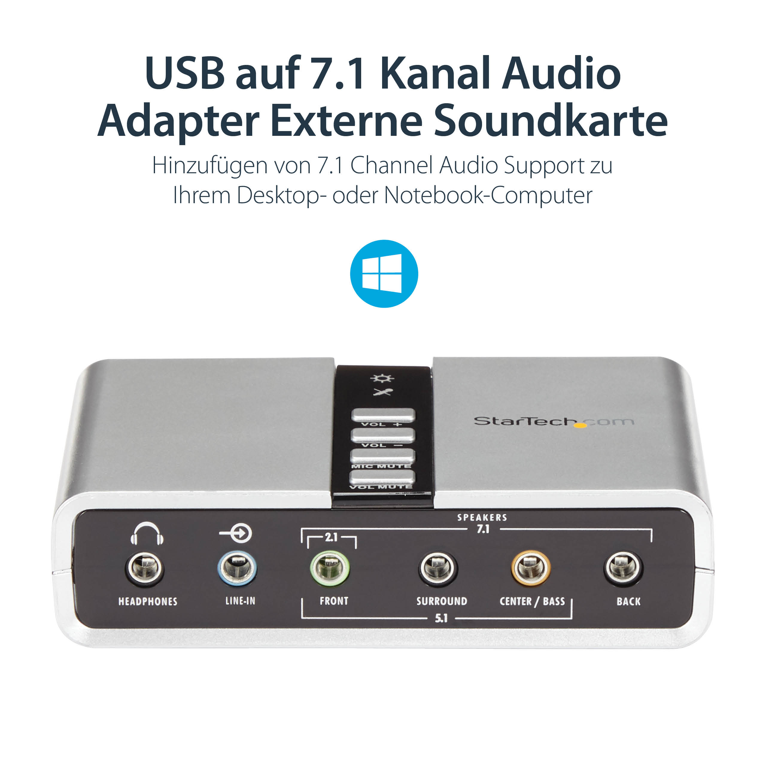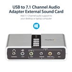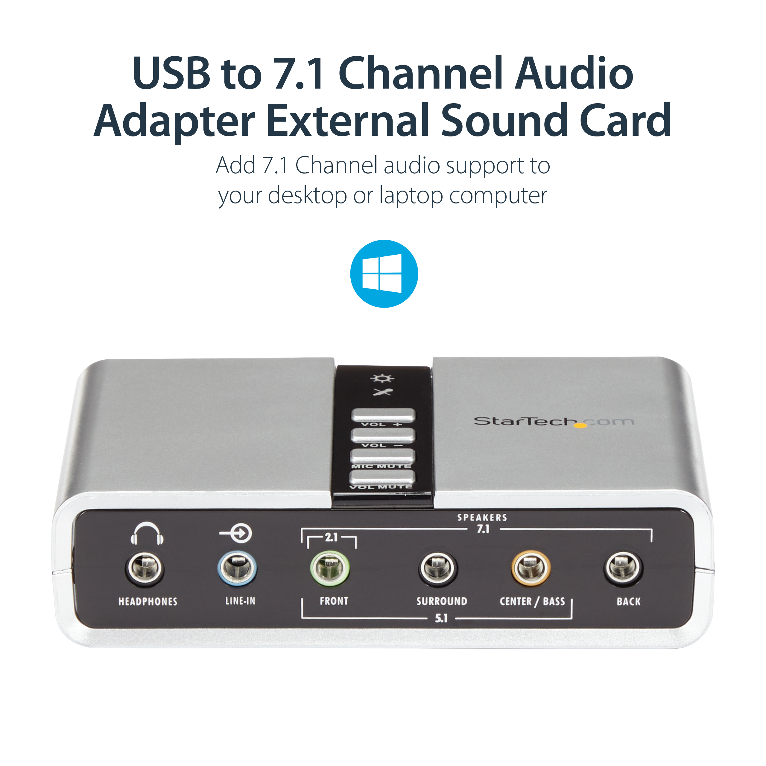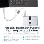 - The StarTech.com ICUSBAUDIO7D audio card supports 7.1 surround sound, enhancing multimedia presentations and virtual meetings.