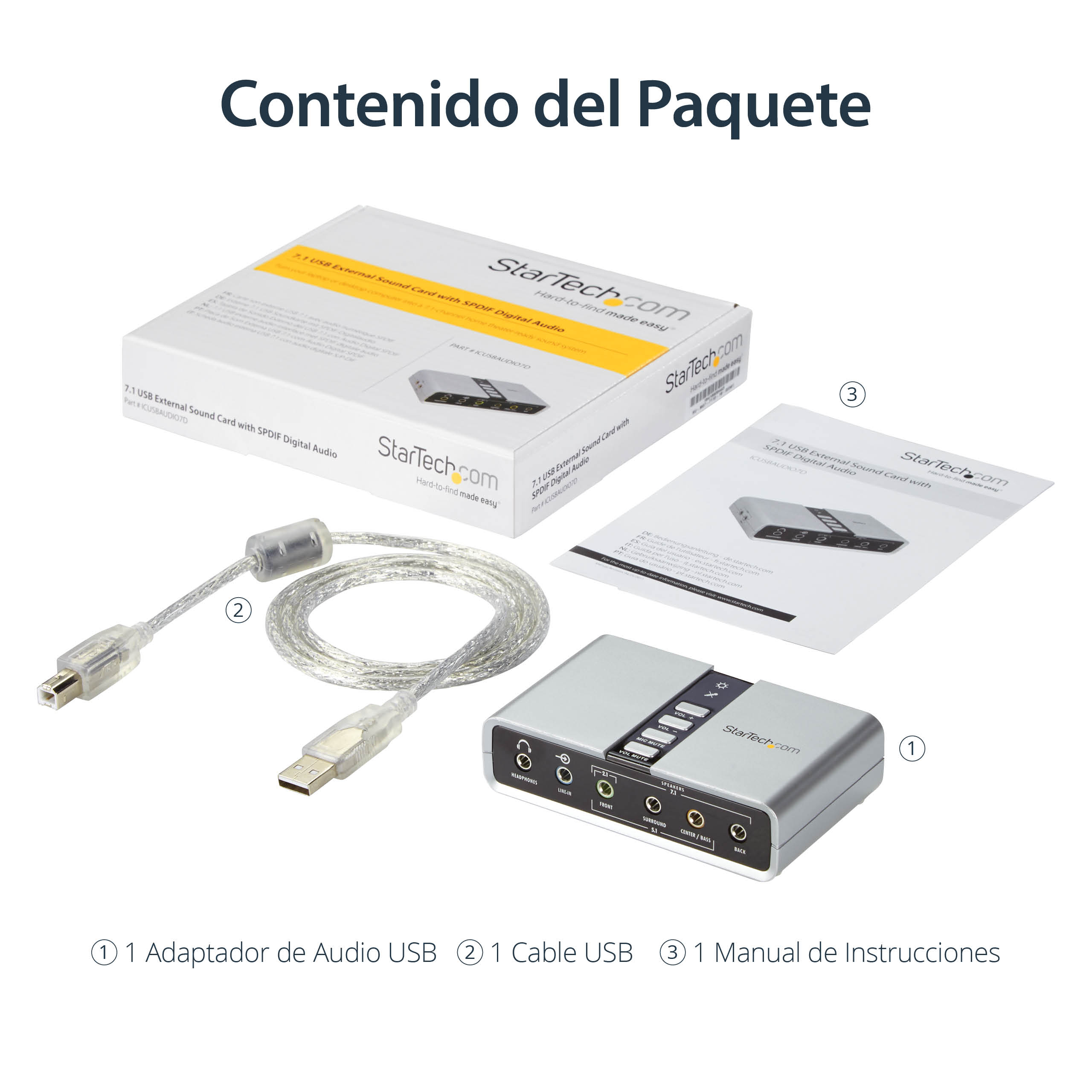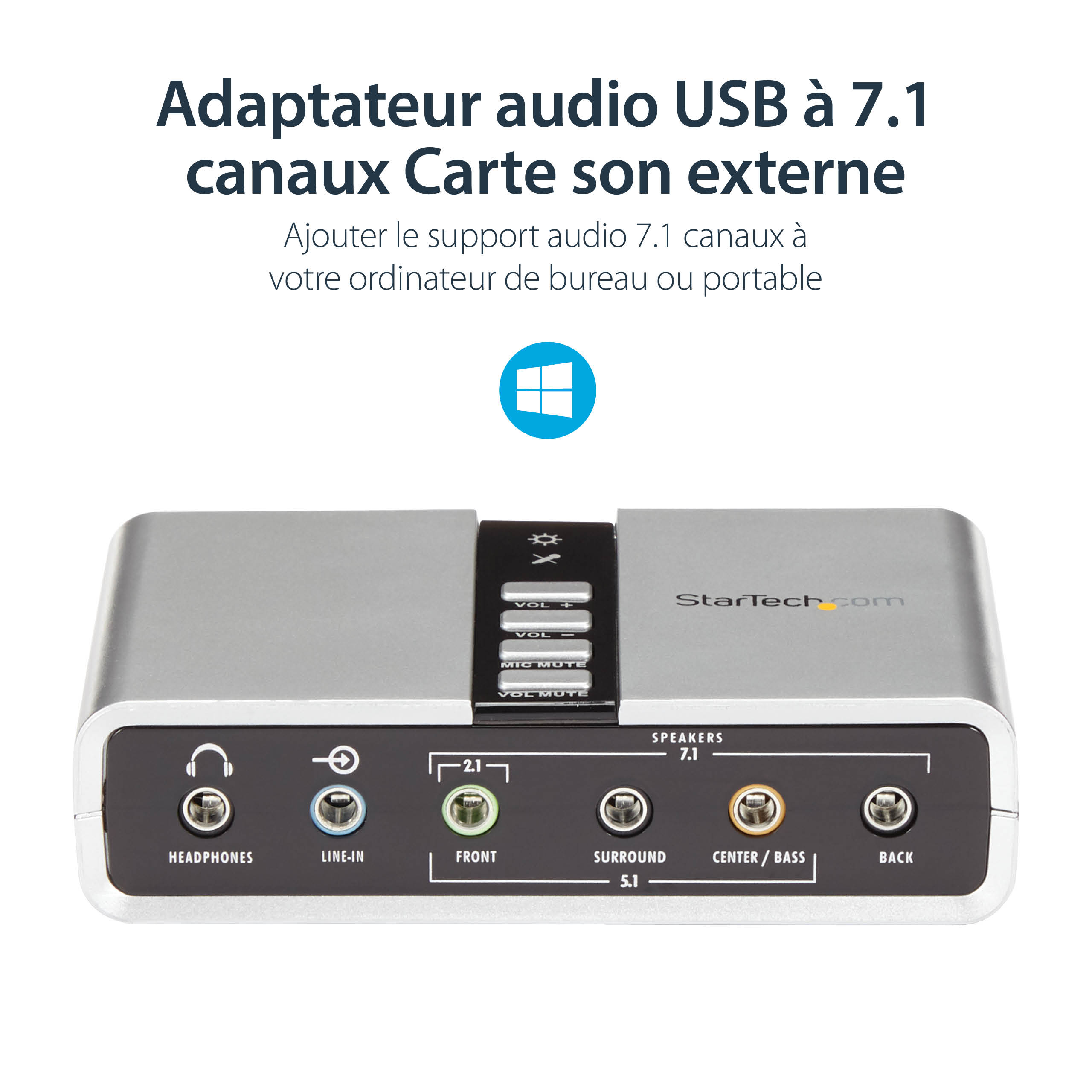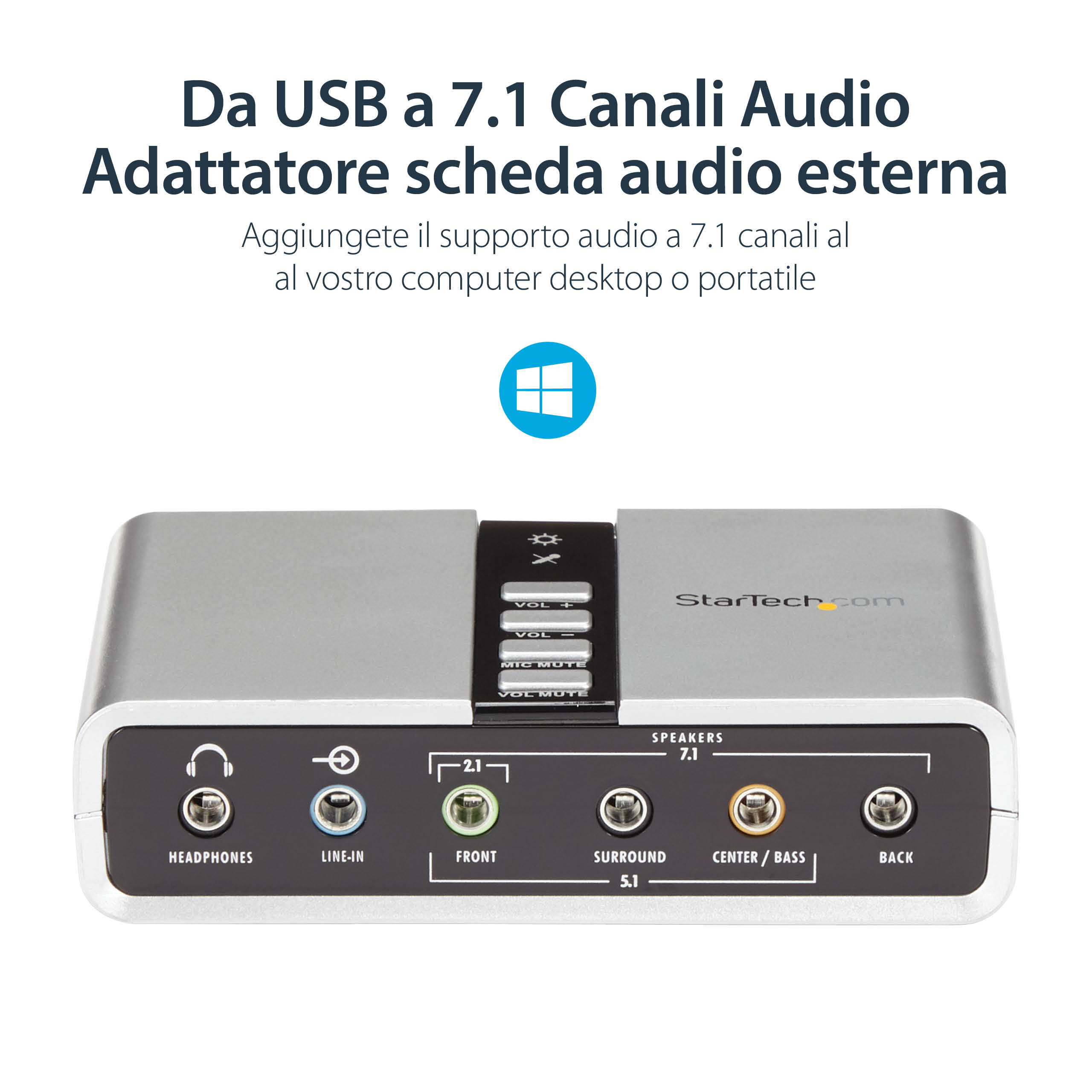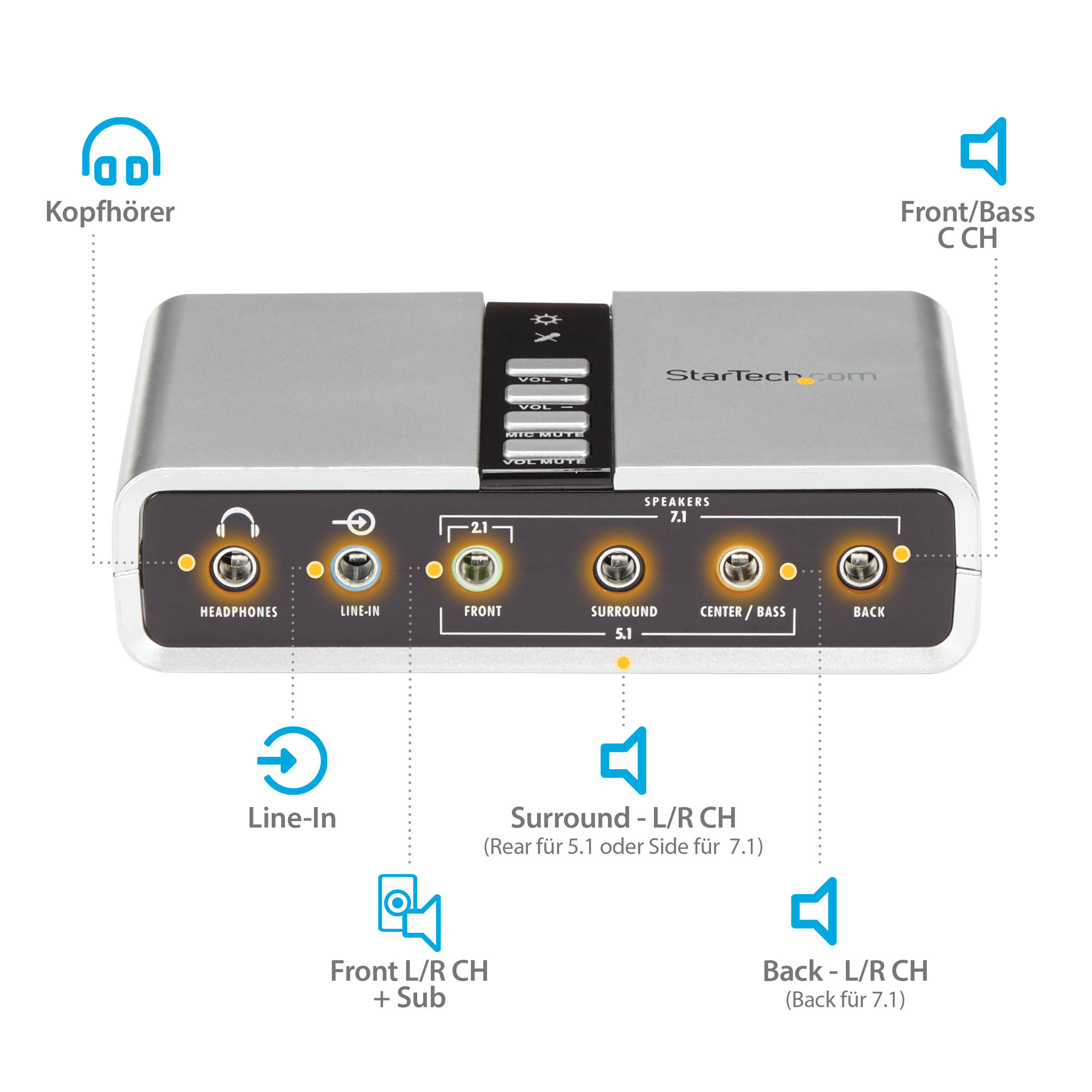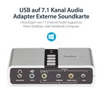 - The StarTech.com ICUSBAUDIO7D audio card supports 7.1 surround sound, enhancing multimedia presentations and virtual meetings.