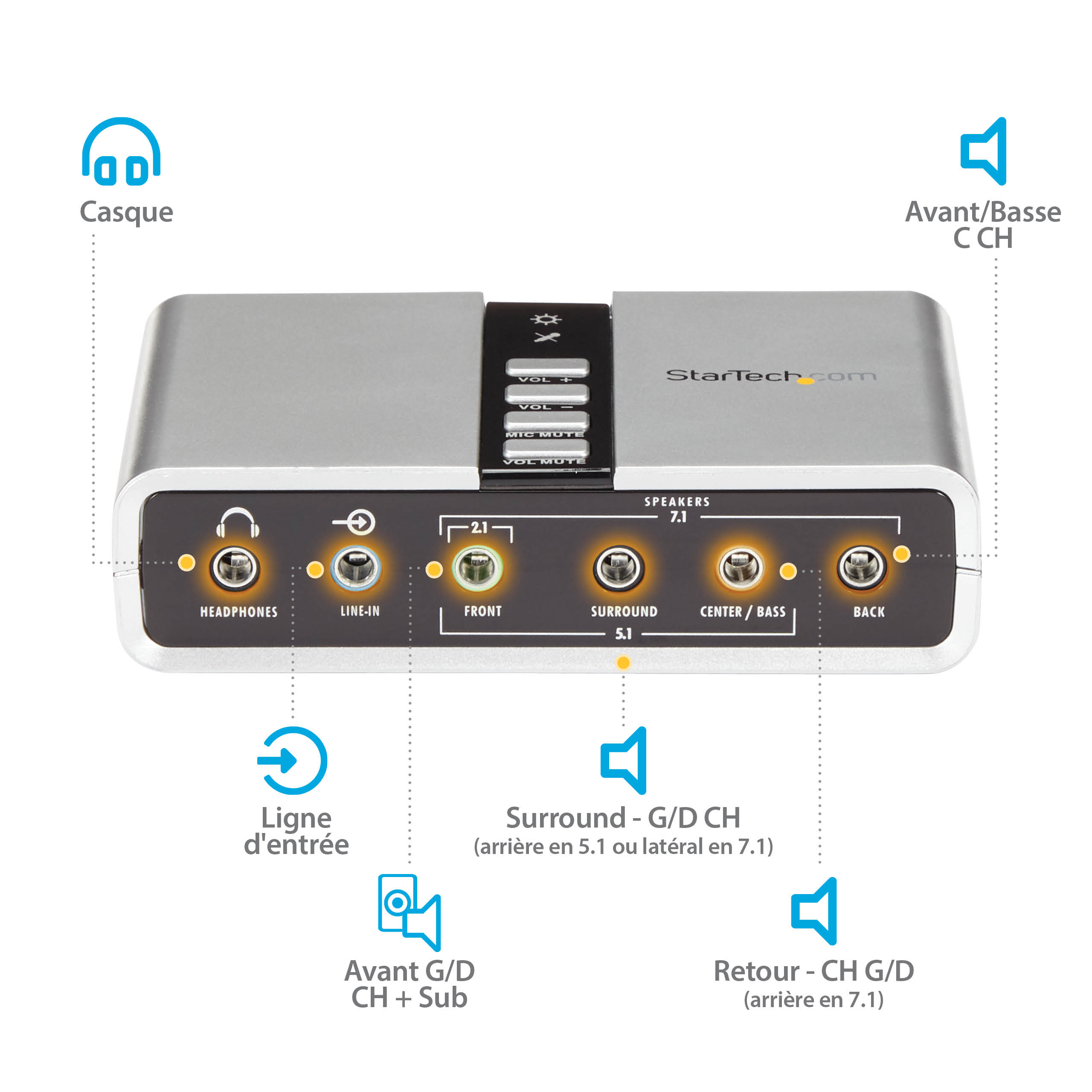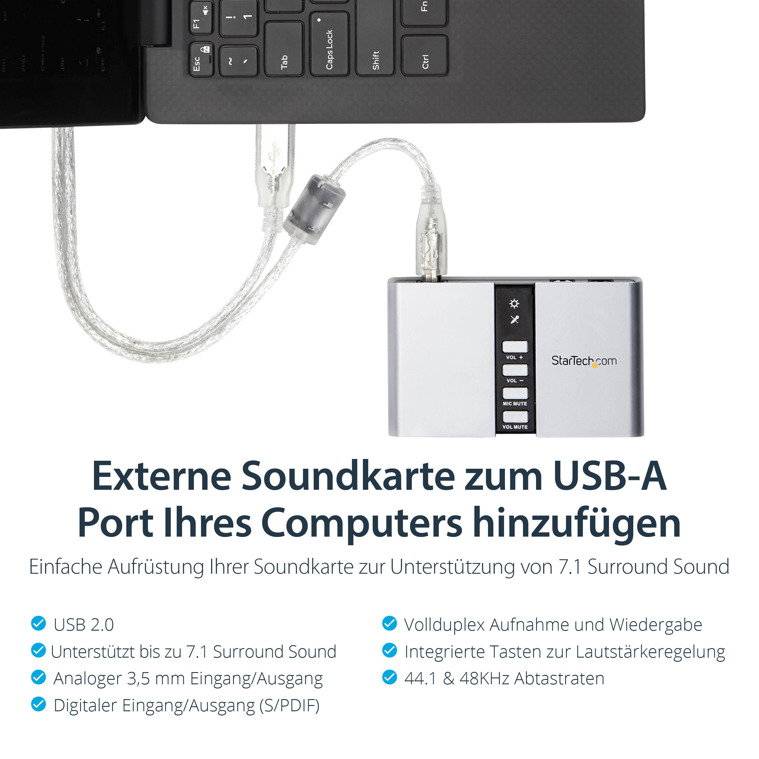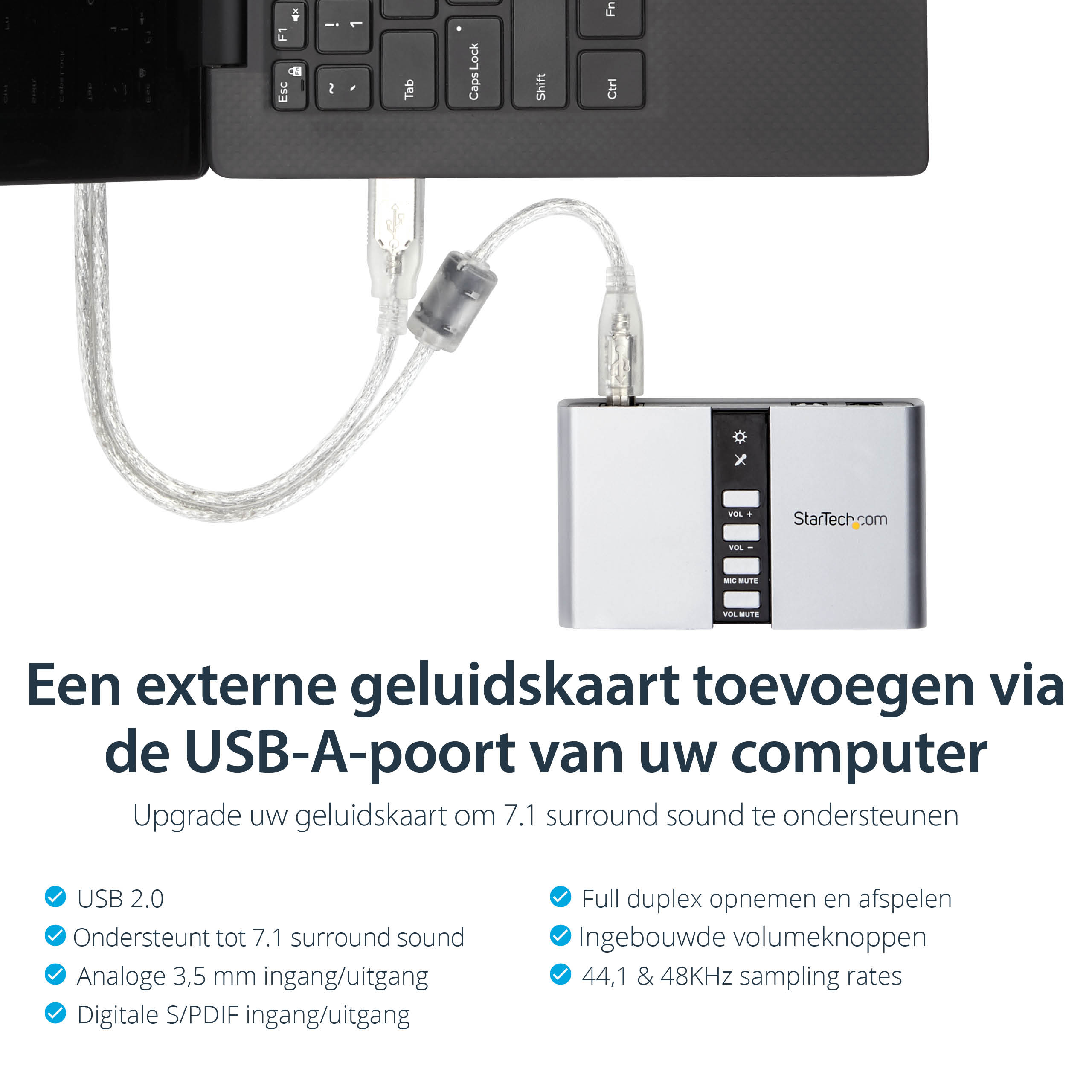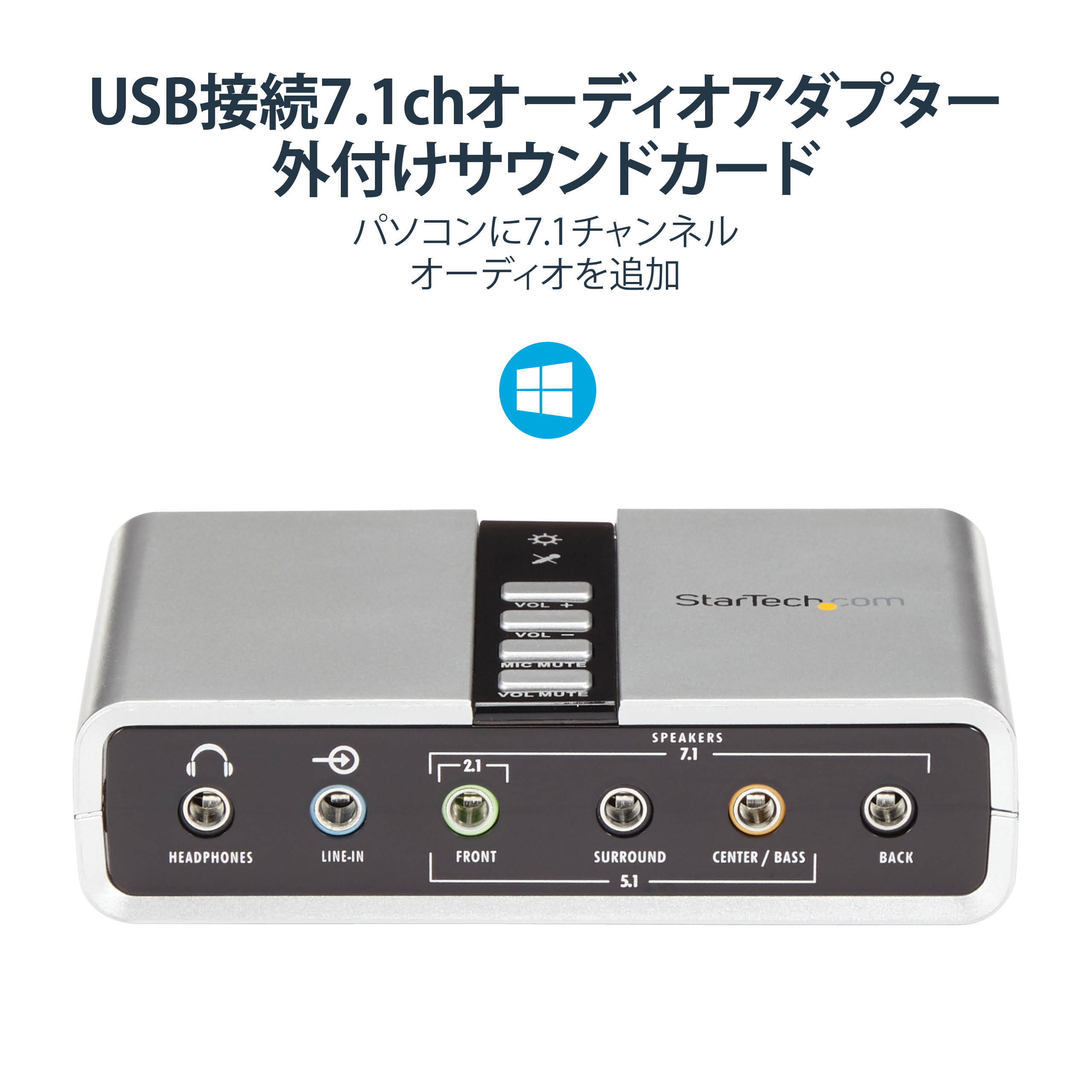 - The StarTech.com ICUSBAUDIO7D audio card supports 7.1 surround sound, enhancing multimedia presentations and virtual meetings.