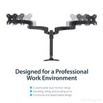The StarTech.com ARMDUAL monitor mount / stand features a sleek, professional design with a matte black finish that blends seamlessly into any office environment. Its minimalist aesthetic complements modern workspaces while providing robust functionality. The smooth articulation of the arms offers effortless adjustments, enhancing user experience without compromising on style.