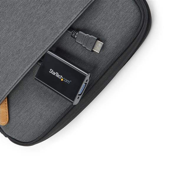 The StarTech.com HD2VGAA2 video cable adapter features a sleek, minimalist design with a sturdy black casing that complements professional office environments. Its compact form factor ensures it fits discreetly alongside existing equipment without clutter. The robust connectors provide a secure fit, minimizing accidental disconnections during critical meetings or presentations.
