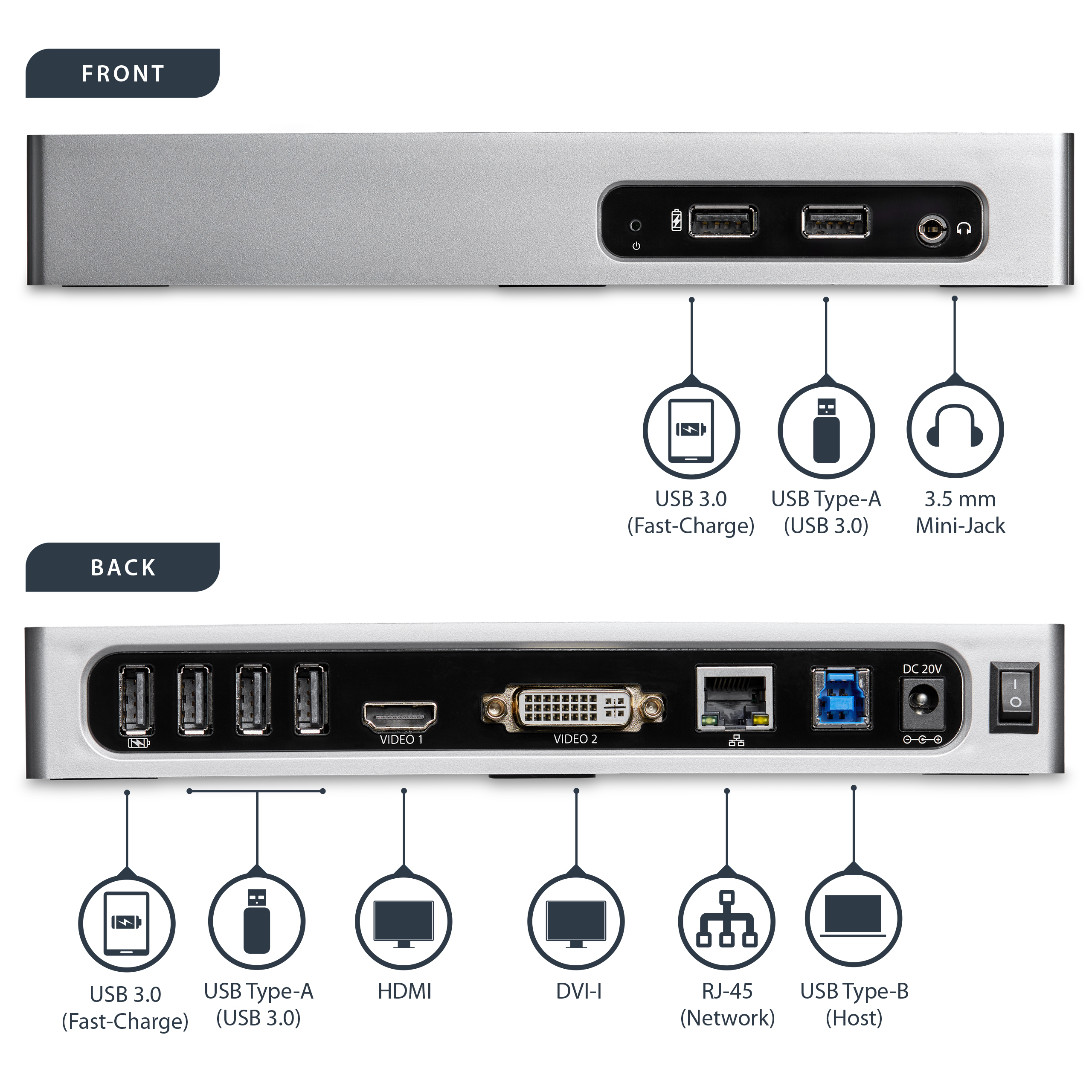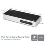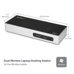 The StarTech.com DK30ADD laptop dock/port replicator features a sleek, professional design with a matte finish that complements modern office aesthetics. Its compact footprint saves valuable desk space while providing easy access to ports. The sturdy chassis offers durability without compromising portability, making it suitable for both fixed and mobile work environments. Thoughtful cable management options help maintain a tidy workspace.