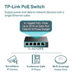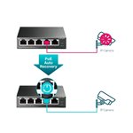 - 5-port Gigabit Ethernet switch with 4 PoE+ ports delivering up to 30W per port for powering IP phones, cameras, and wireless access points.