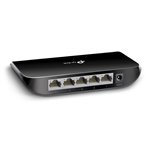 The TP-Link TL-SG1005D network switch features a compact, sturdy metal chassis with a sleek black finish, making it suitable for both desktop and rack-mounted setups. Its minimalist design includes LED indicators for each port, providing clear status updates at a glance. The quiet operation ensures it fits seamlessly into office environments without disruption.