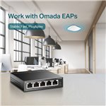 The TP-Link TL-SG1005P network switch features a compact, sturdy metal chassis with a sleek black finish that fits neatly into any office setup. Its LED indicators provide clear status updates for each port, simplifying network monitoring. The fanless design ensures silent operation, making it unobtrusive in quiet workspaces. Its small footprint allows flexible placement options, whether mounted on a desk or wall.