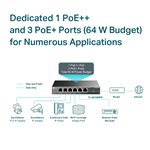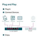 - 6 Gigabit ports with PoE+ support delivering up to 30W per port, perfect for powering IP phones, cameras, and wireless access points without additional cabling.